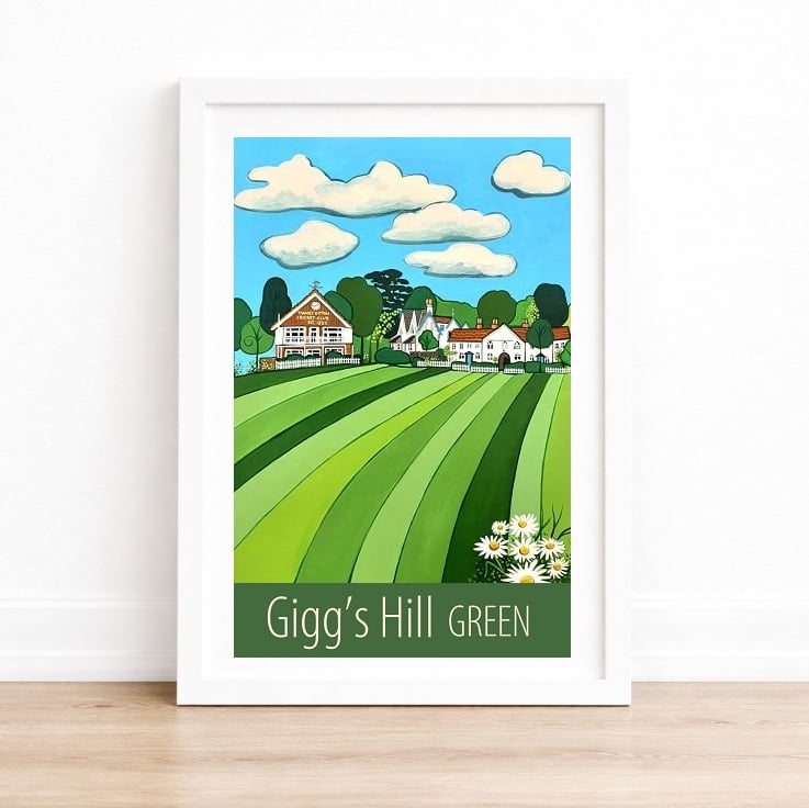 A contemporary travel poster style print of Gigg's Hill Green, and cricket club, in Thames Ditton, Surrey, from my own original acrylic painting. A perfect gift for those who play cricket on Gigg's Hill Green!