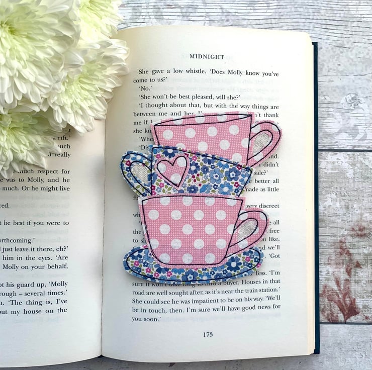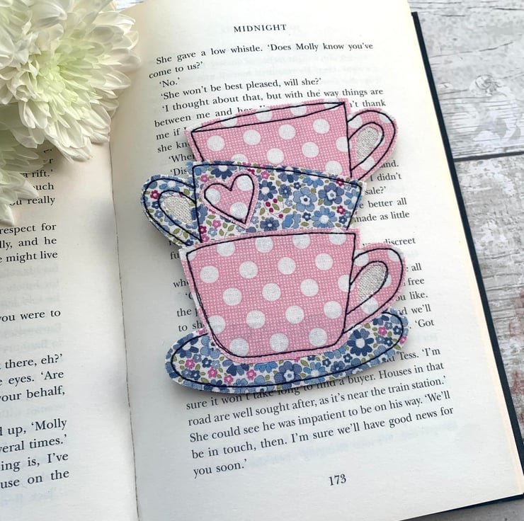 A pretty tea cup stack bookmark in pink and blue floral fabrics.