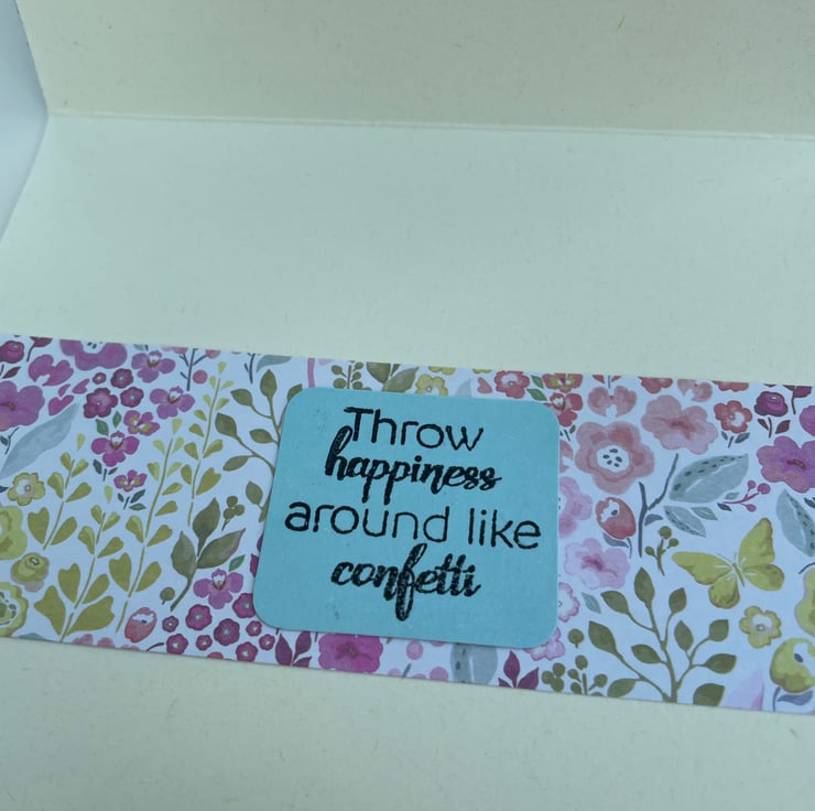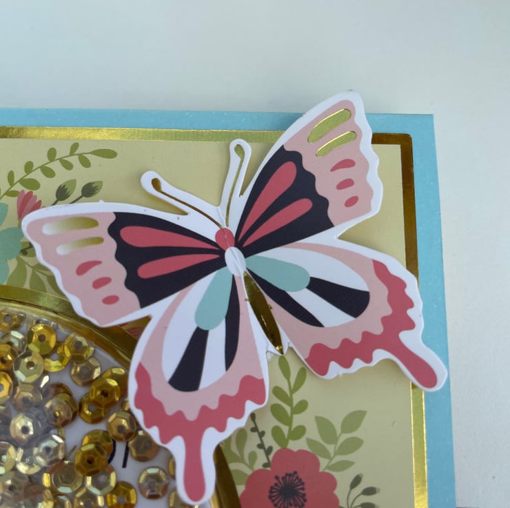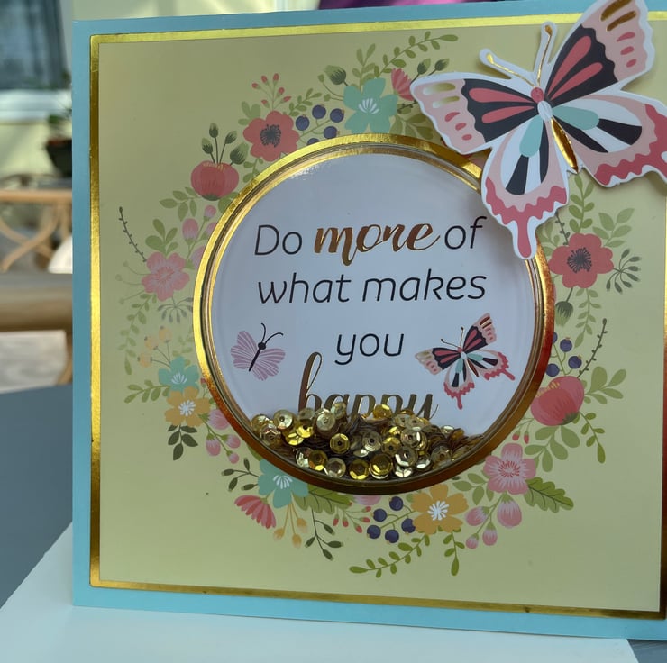 Spring vibes sequin shaker card for any occation. This 14x14cm square card features a circle of flowers surrounding the shaker apature. The shaker has Do more of what makes you happy written in it and gold sequins to make the shake. A matching butterfly finishes the design. Inside the card has floral paper and the greeting Throw happiness around like confetti. A versatile card for many occations.