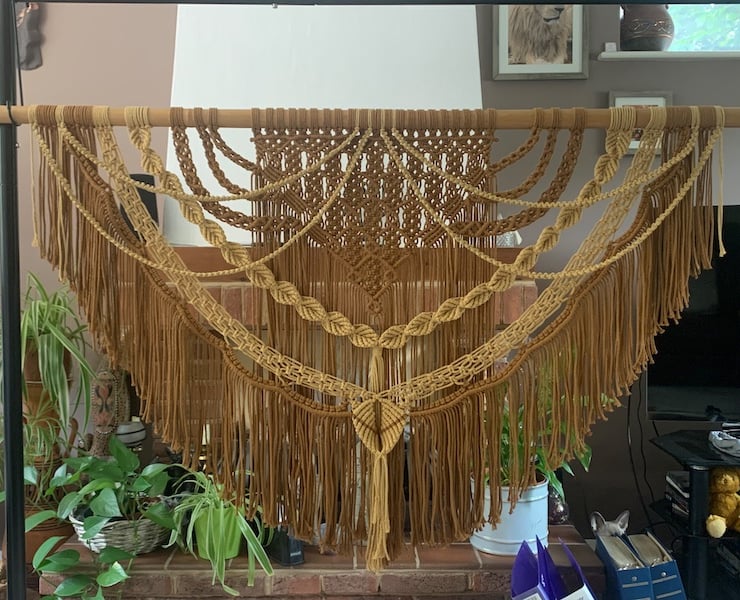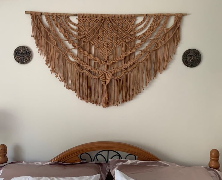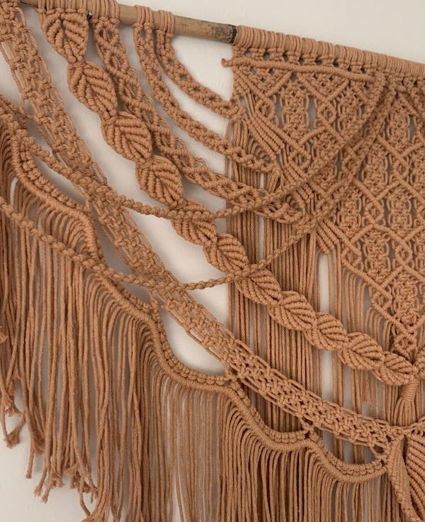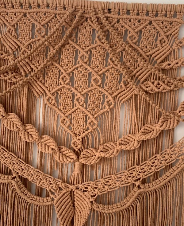 This stunning macrame wall hanging looks super above your bed or in a hallway. it is made with 3mm 3 strand cord and can be made in most colours. The main (photo is caramel and sand and is a custom order. Each creation is tied to a bamboo cane and each of the layers is a different pattern. Canes can be 120cm - 150cm in length approximately and have a diameter of between 1-2cm. As bamboo is a natural resource, each cane will differ slightly.