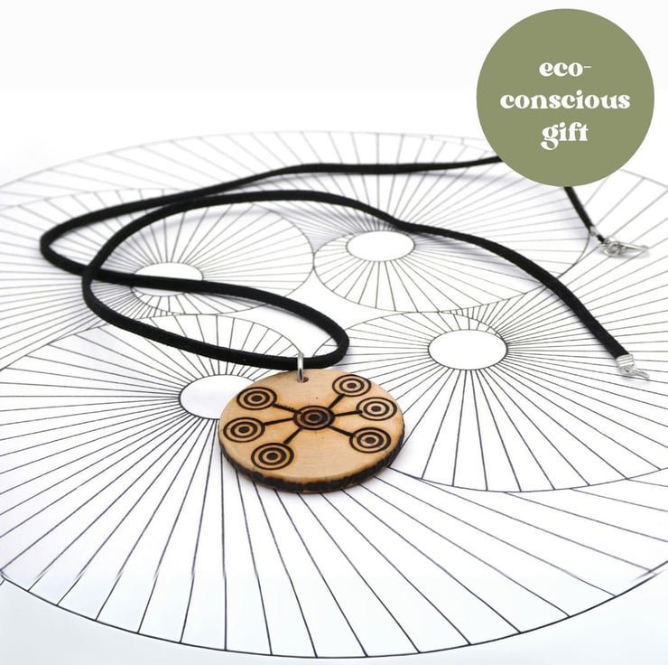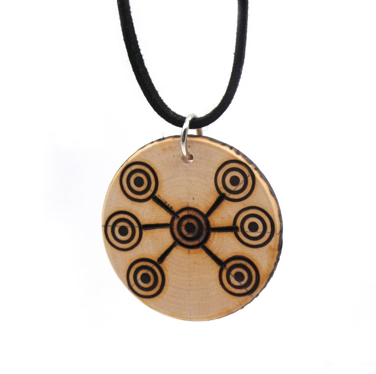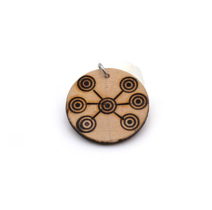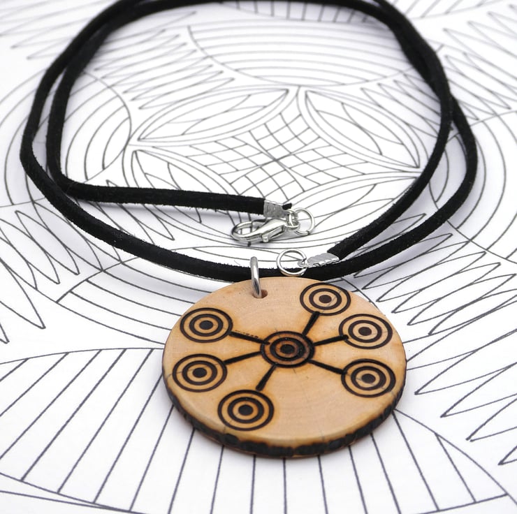 This particular pendant with the circle in the middle and 6 other circles connecting, represents in my view the inter planetary connection we observed when we visited the Temple of Hathor in Dendara. The Earth is a central figure for this piece, whilst the other celestial bodies connect to it through an invisible tether.
