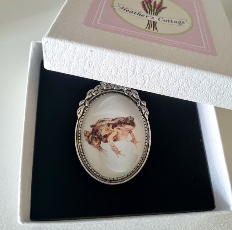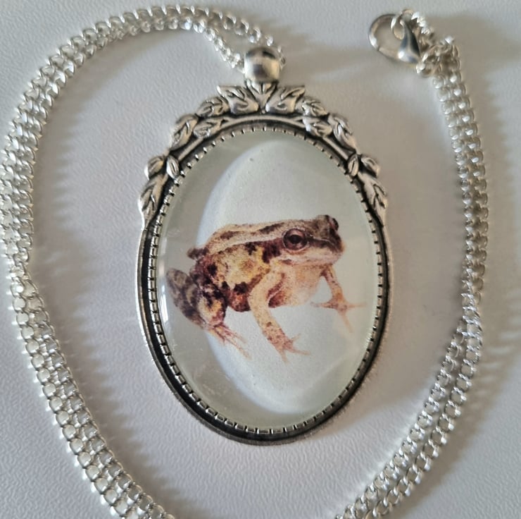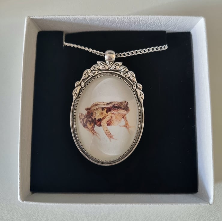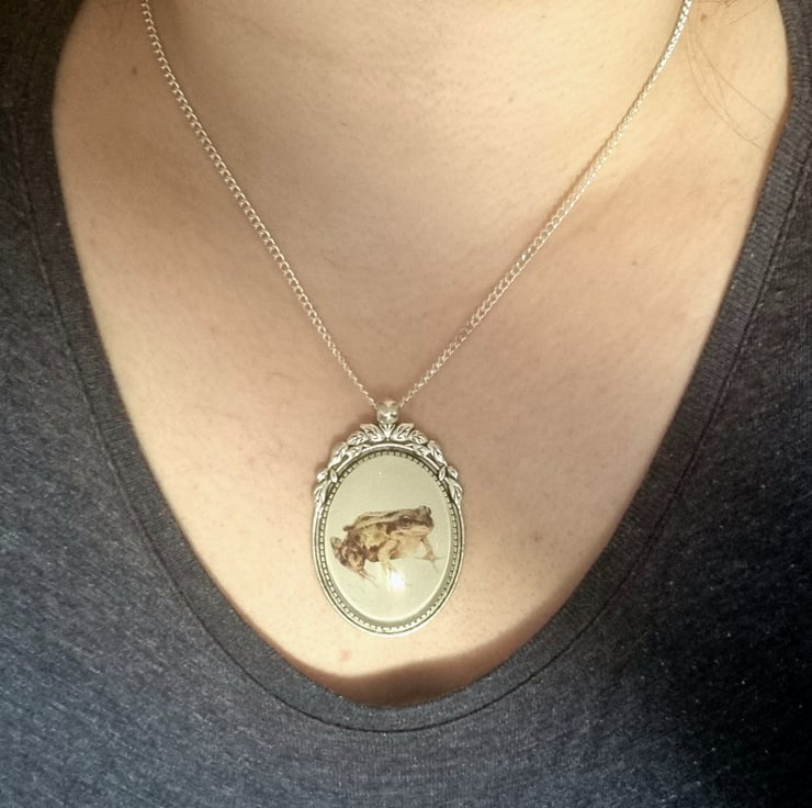 Antique silver effect necklace with a frog illustration set in a cameo style pendant with decorative leaves. Necklace comes presented in a Heather's Cottage box.