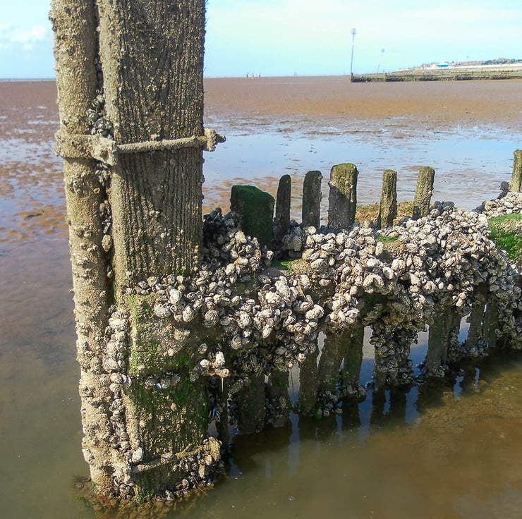 This card features a photo I took on 26th July 2021 of barnacles clinging to the side of a wooden groyne at Hunstanton Beach in Norfolk.