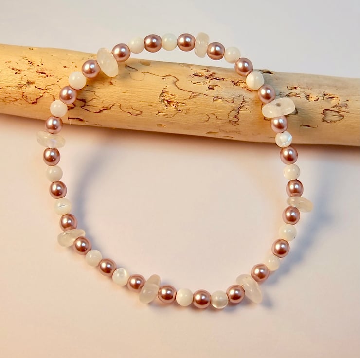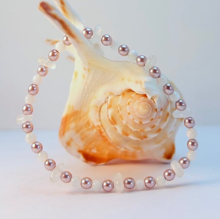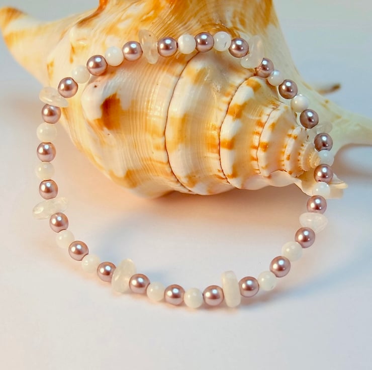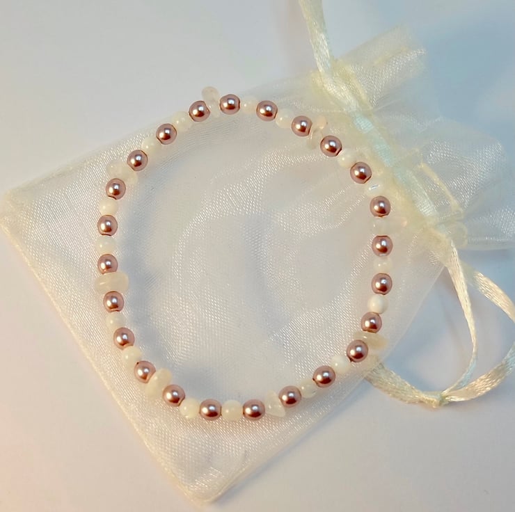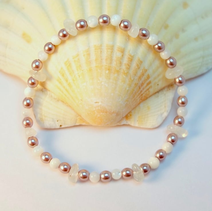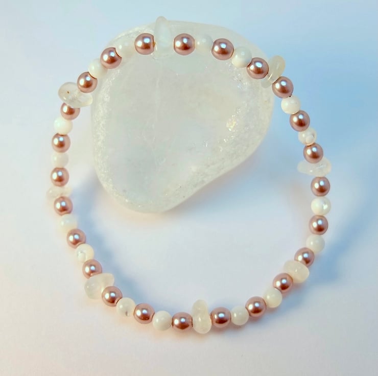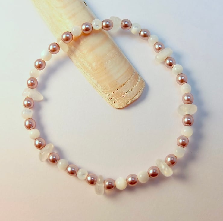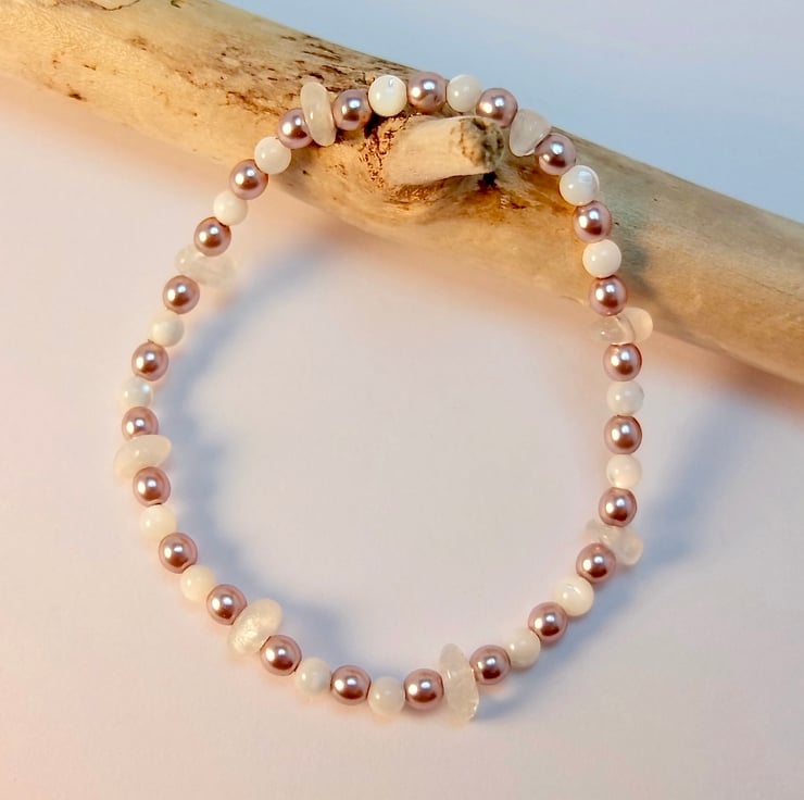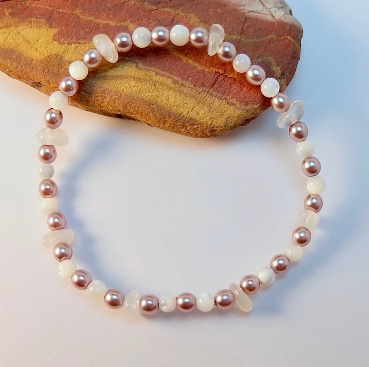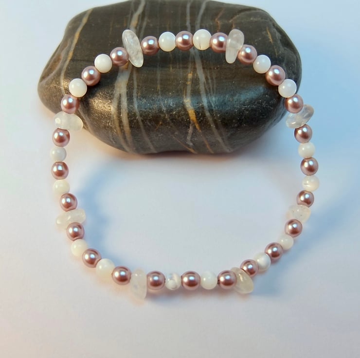 Pretty, dainty bracelet of white Moonstone chips, 4mm white mother-of-pearl beads and 4mm Czech glass, dusky mauve pearls.