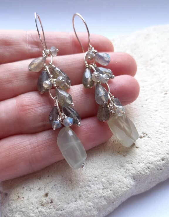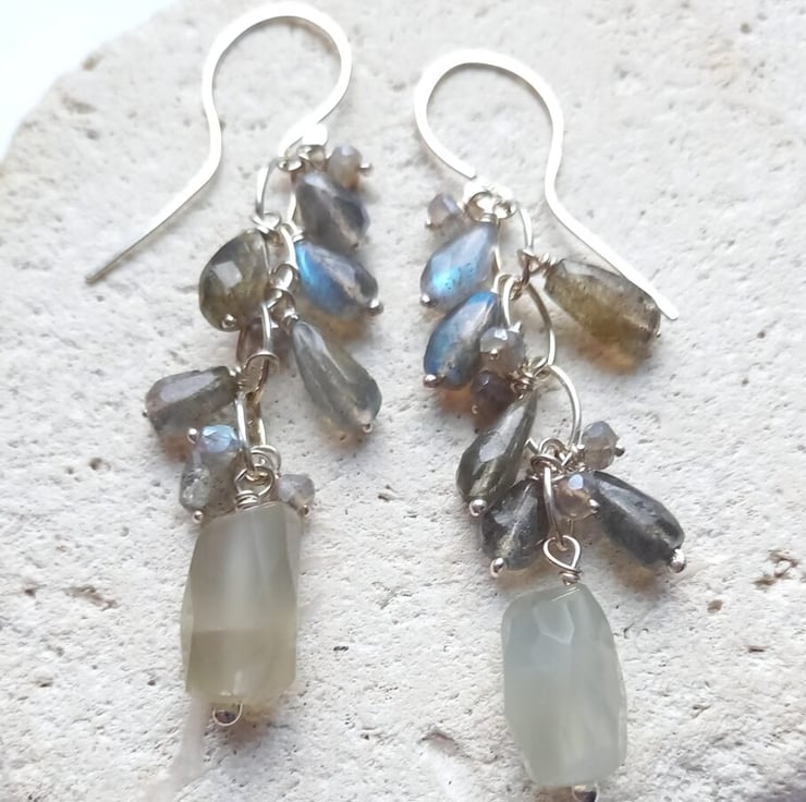 Dazzling grey labradorite and moonstone statement waterfall earrings with handmade silver hooks.