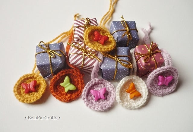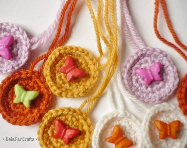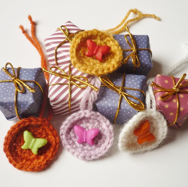 I hand crocheted the tags with wool blend yarn and added butterfly ornamental buttons. They measure about 3.5cm (1.5in) in diameter and come with matching yarn attached.