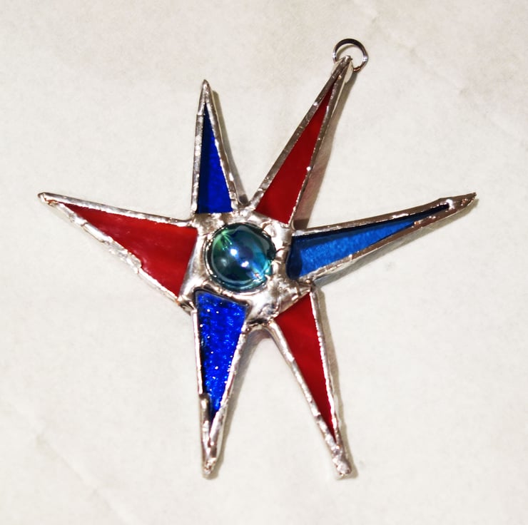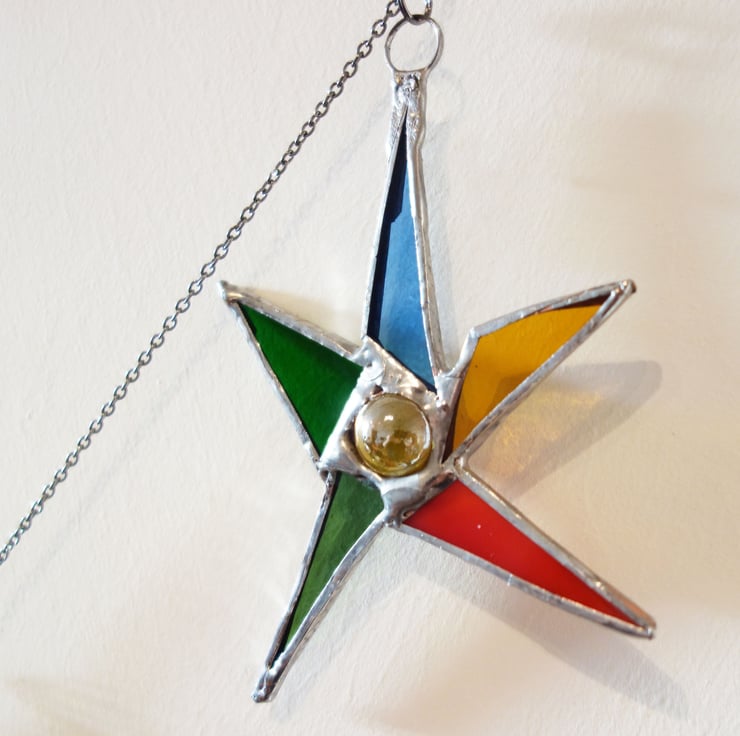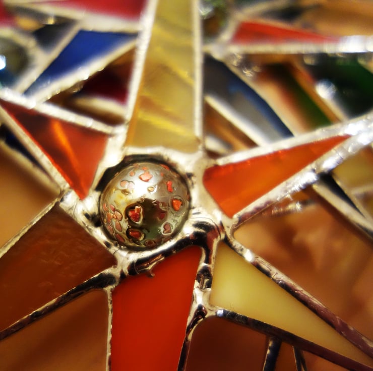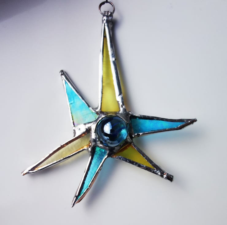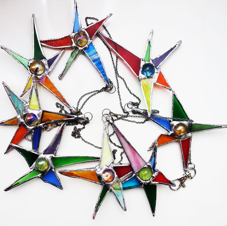 Spikey Sputnik Star suncatcher window ornament. Made from a mix of different colours and textures with a marble or jewel centre.