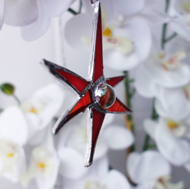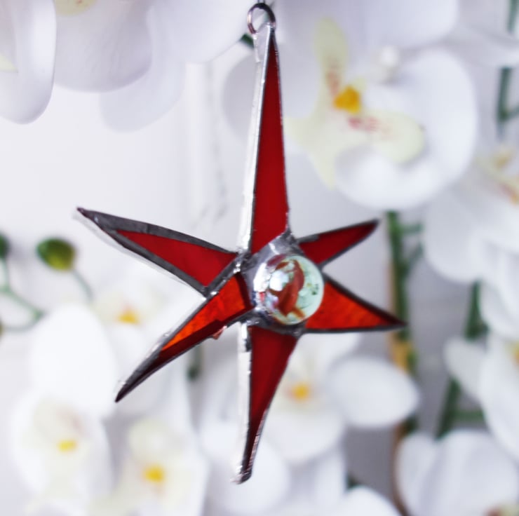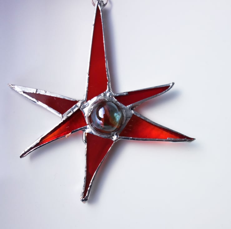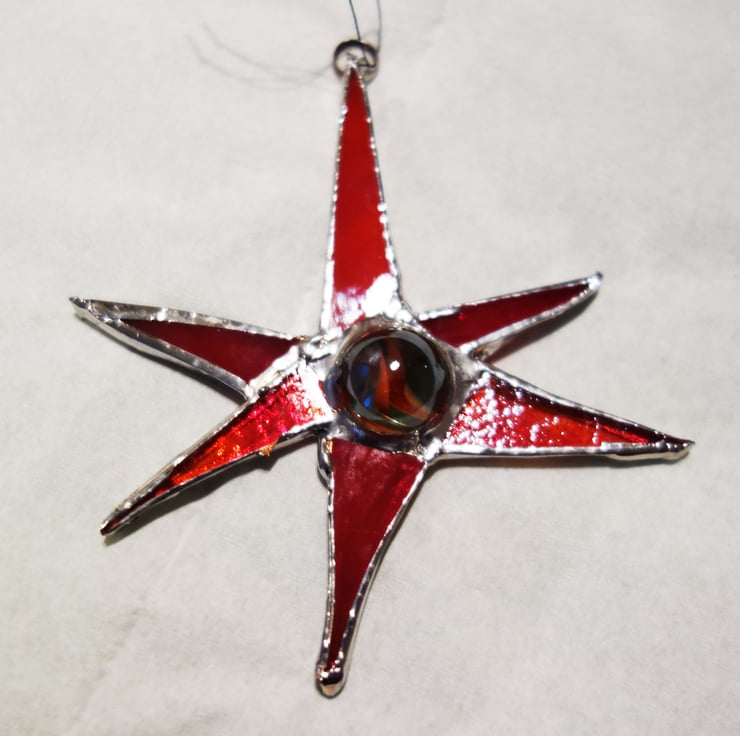 Funky little suncatcher made from stained glass. This one is red with a chrome finish to the solder. Vintage marble centrepiece.