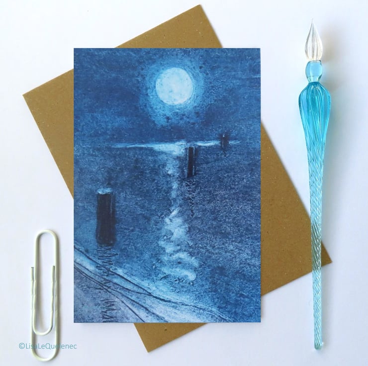 Moonrise over the sea from Bournemouth beach reflected in the water. Reproduced from my original collagraph print.