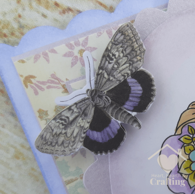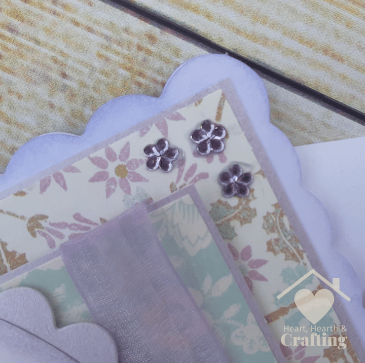 I've kept the embellishments quite simple. There's a beautiful butterfly in one corner and a length of lilac organza ribbon on the other side. I've added a tiny touch of sparkle with little flower gems in soft lilac.