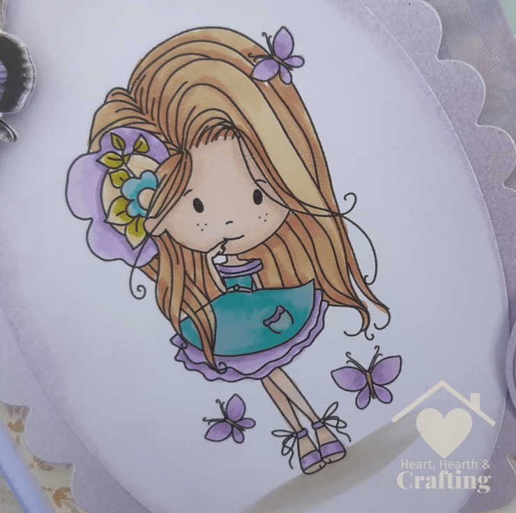 This pretty little girl is hand coloured using high quality alcohol markers for a really vibrant design. She really stands out against the subtly distressed vintage papers in soft shades of lilac and teal.