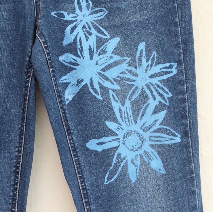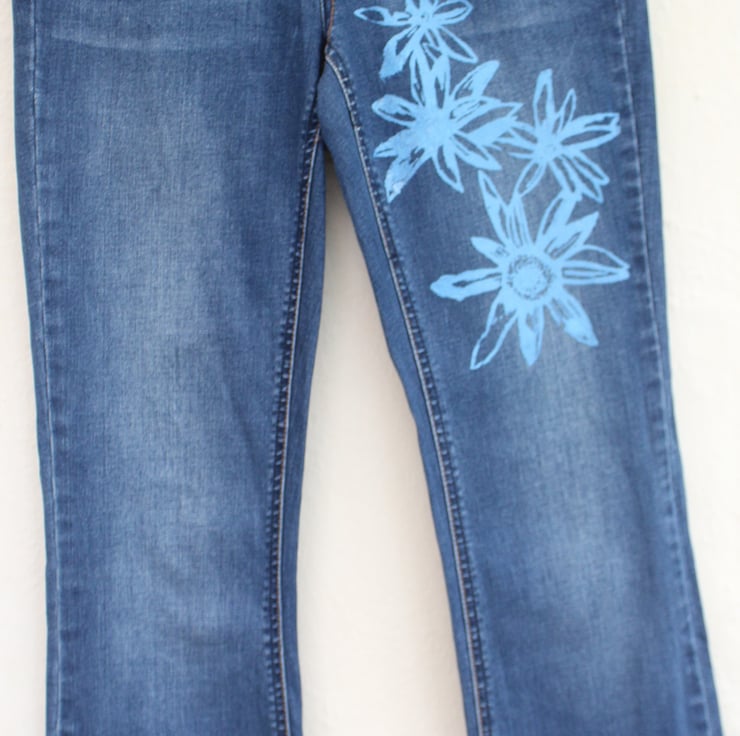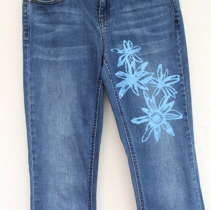Ladies UK SIZE 8 new look bootcut jeans, the jeans have been reworked and hand screen printed with my unique flower design.