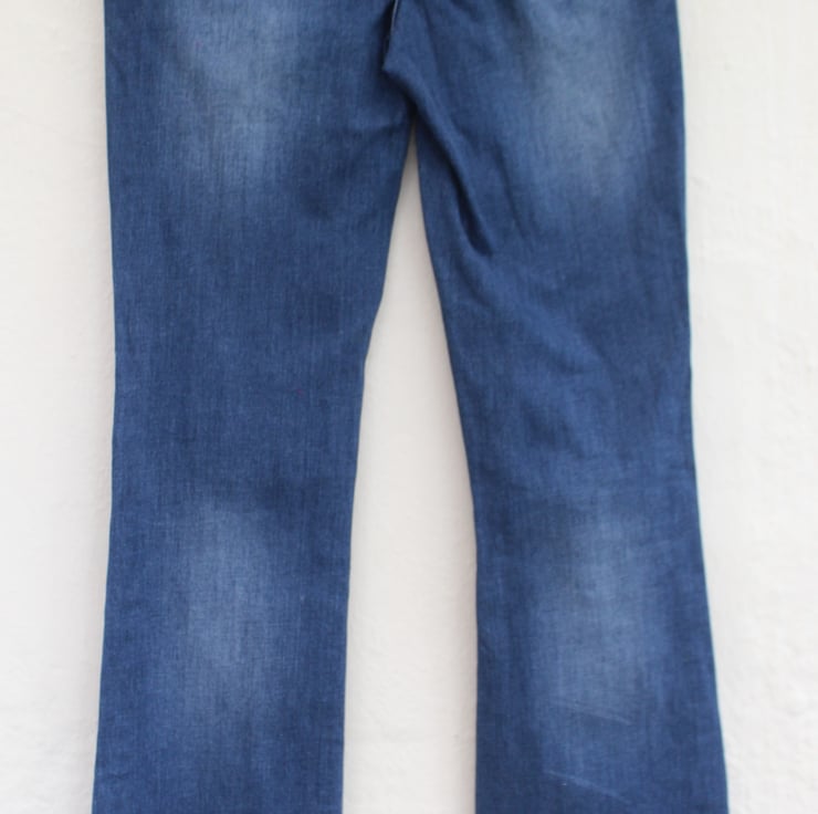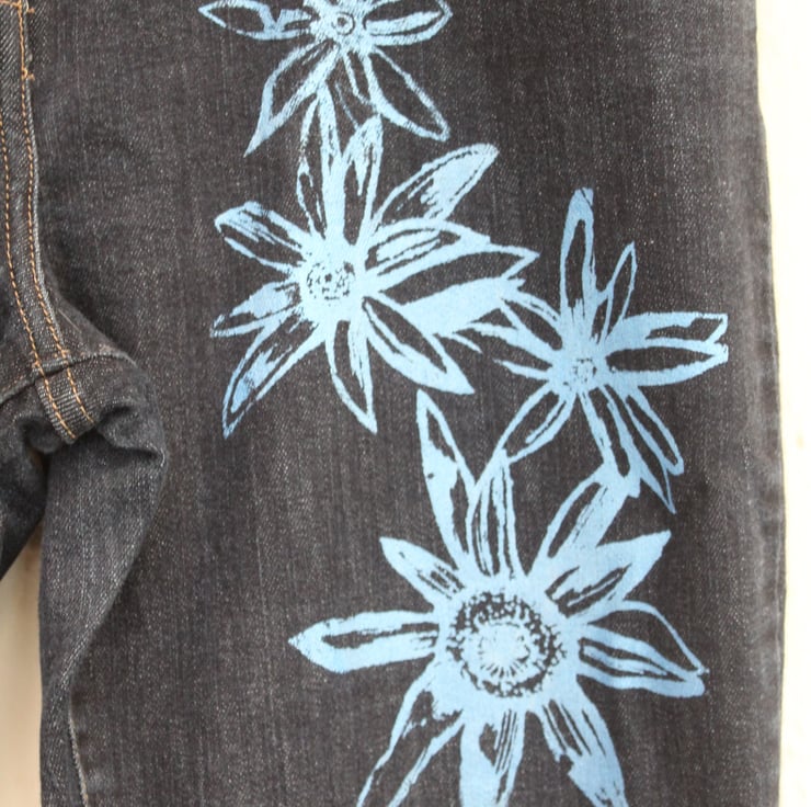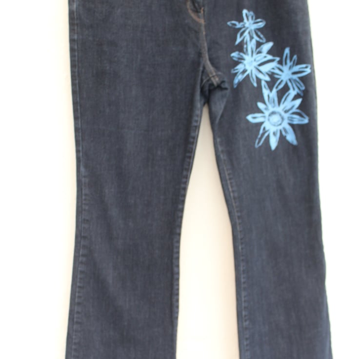Ladies UK SIZE 16 NEXT petit bootcut jeans, the jeans have been reworked and hand screen printed with my unique flower design.