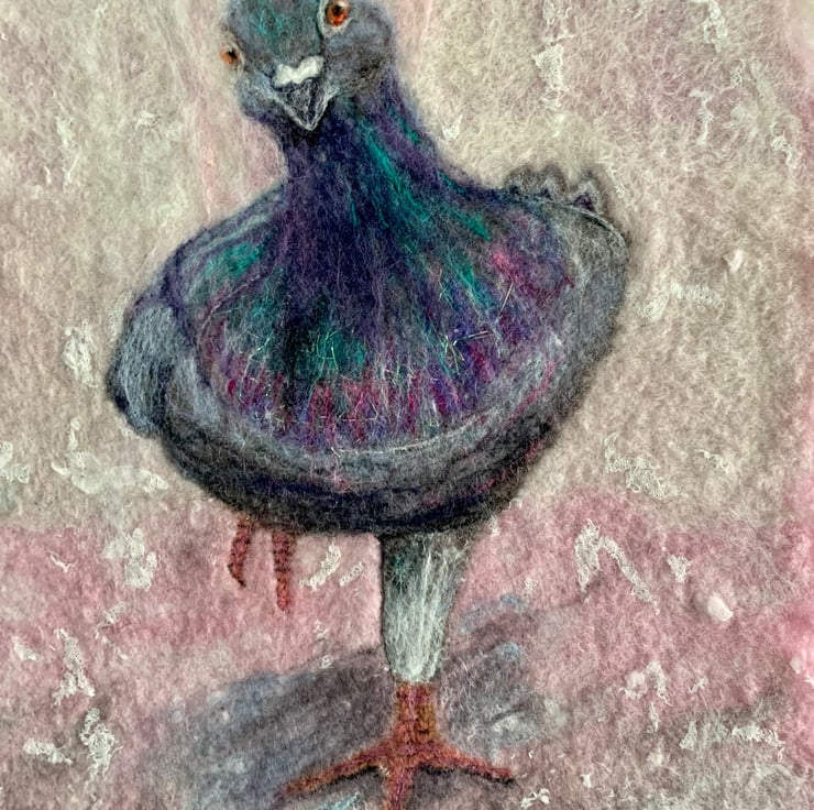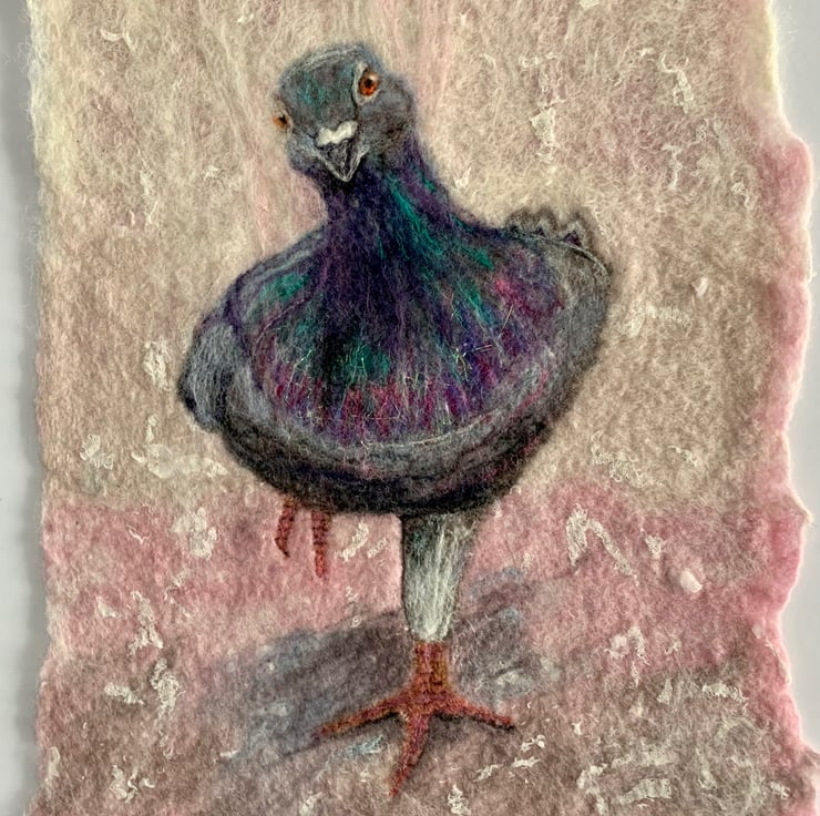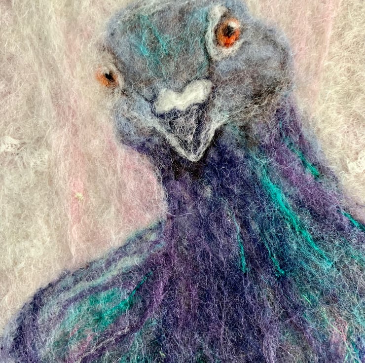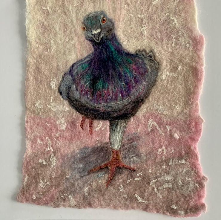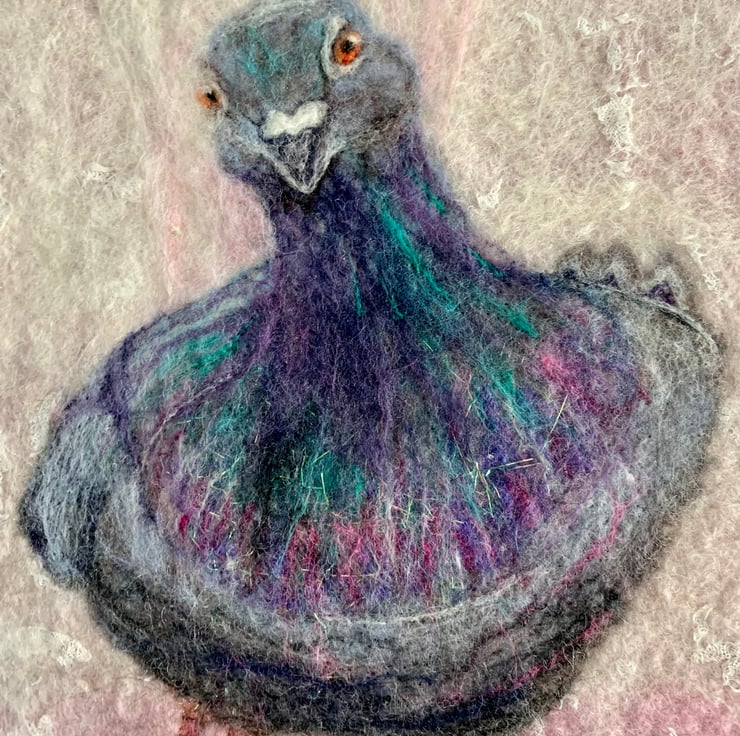 A wet and needle felted pigeon made from merino wool and silk fibres.