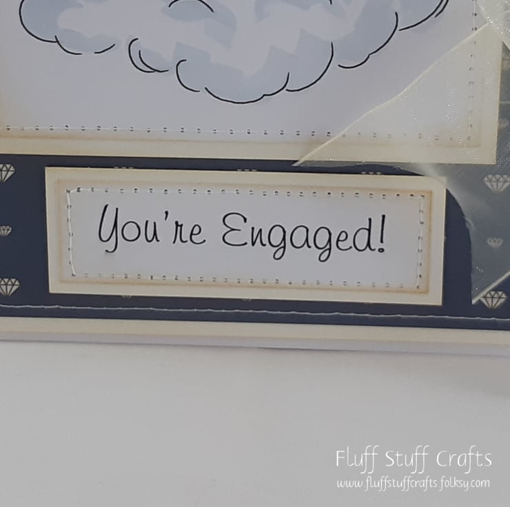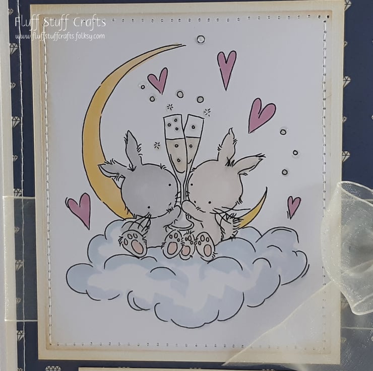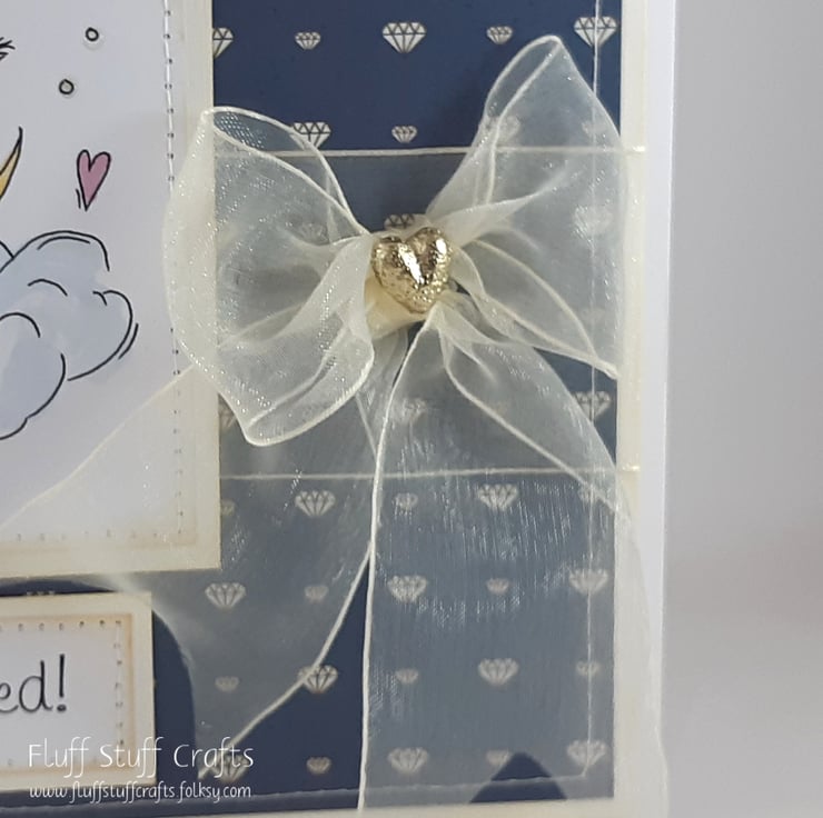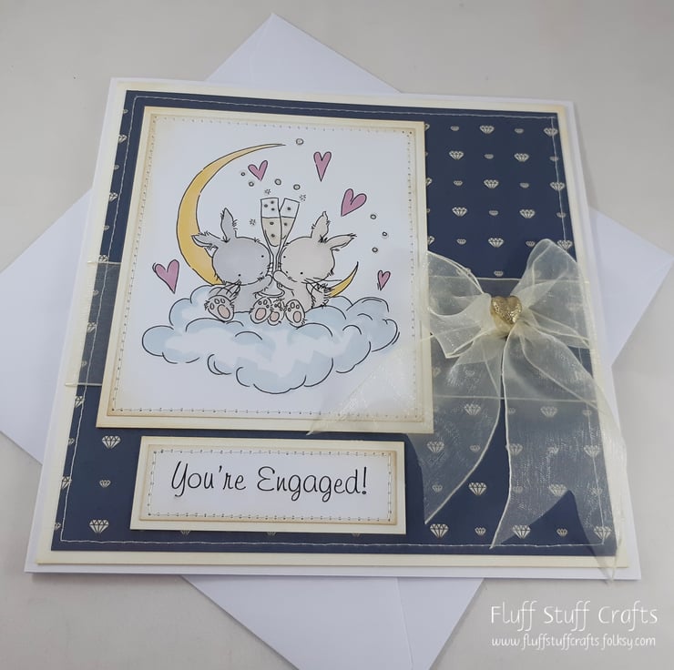 Square engagement card featuring a cute image of two bunnies, celebrating on a cloud, with glasses of champagne. The image has been edged with distress ink and then stitched onto cream card, as has the sentiment 'You're Engaged!'. The background is dark blue with a pattern of diamonds, also stitched onto cream card. The card is embellished with cream organza ribbon and bow with a small gold heart at the centre.