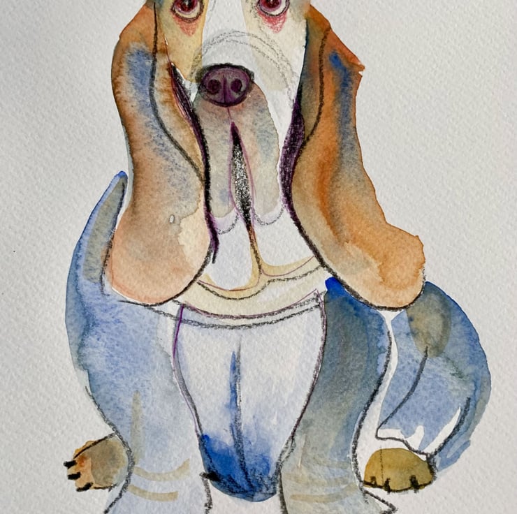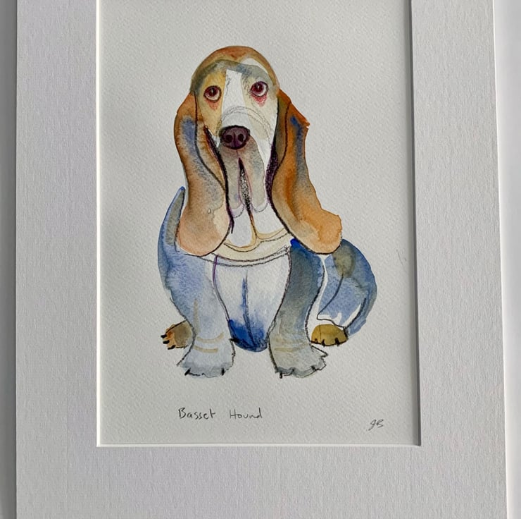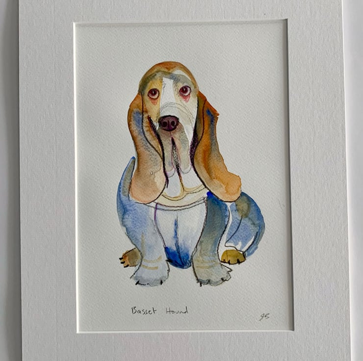 An original watercolour and mixed media painting of a basset hound. This little dog has a big character and is looking for a new home. The painting is on A4 watercolour paper and window mounted ready for you to frame and enjoy.