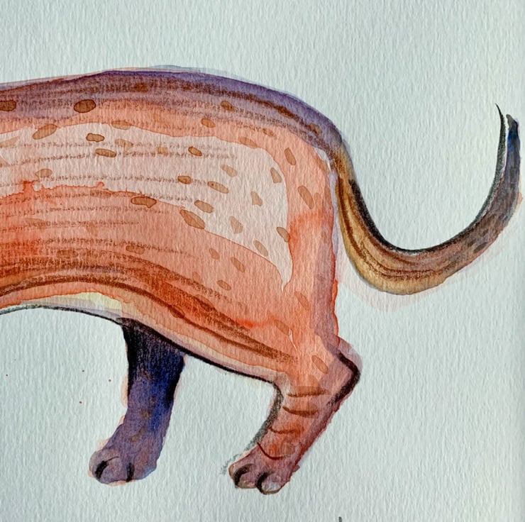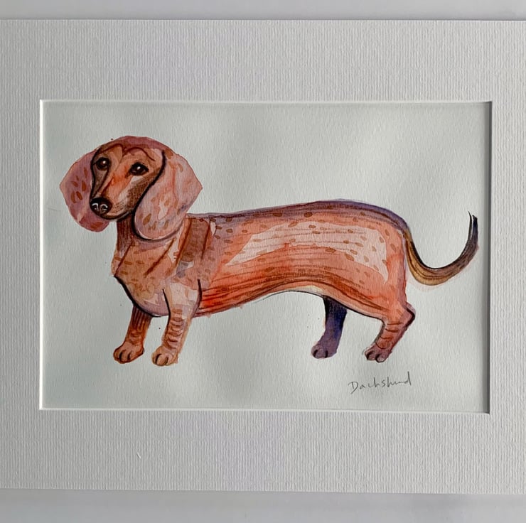 An original watercolour and mixed media painting of a pretty dachshund dog. Expressive and appealing this little character is looking for a new home.