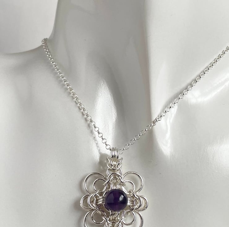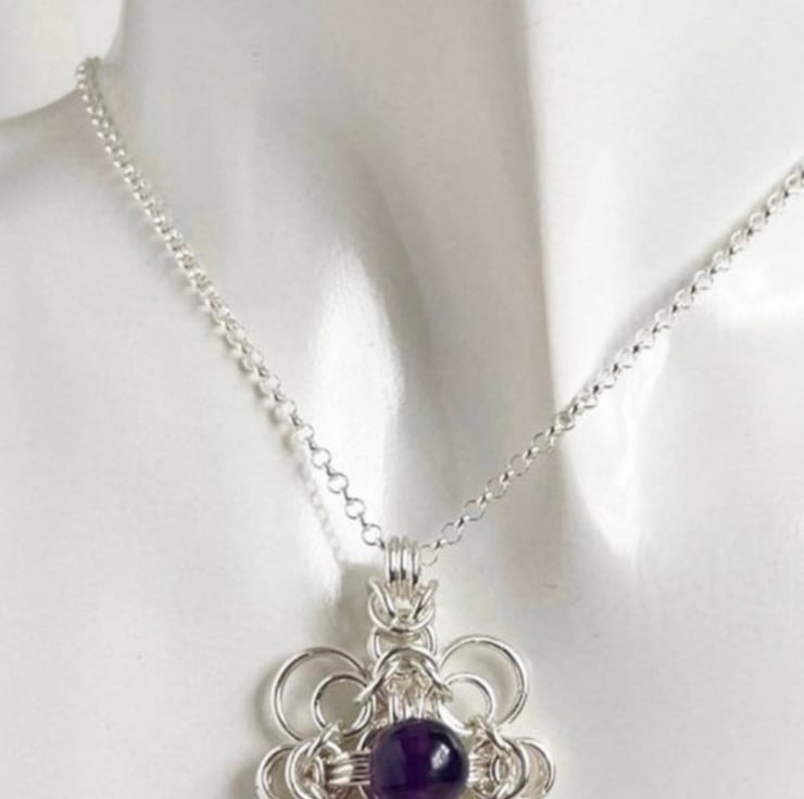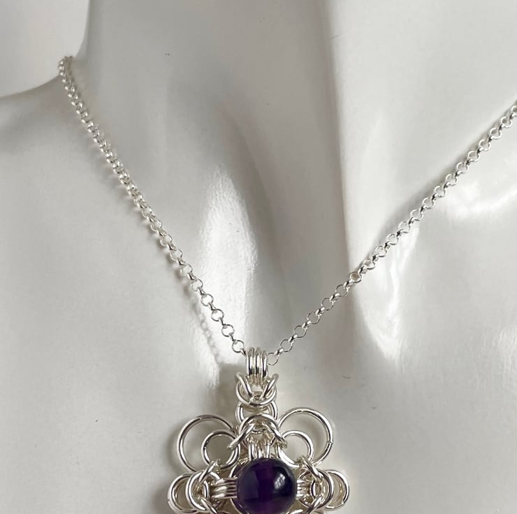 Sterling Silver rings have been linked to form this beautiful chainmaille Celtic styled pendant which has an 8mm deep purple amethyst gemstone in the centre.