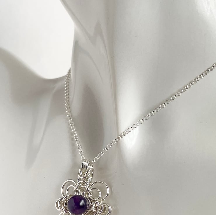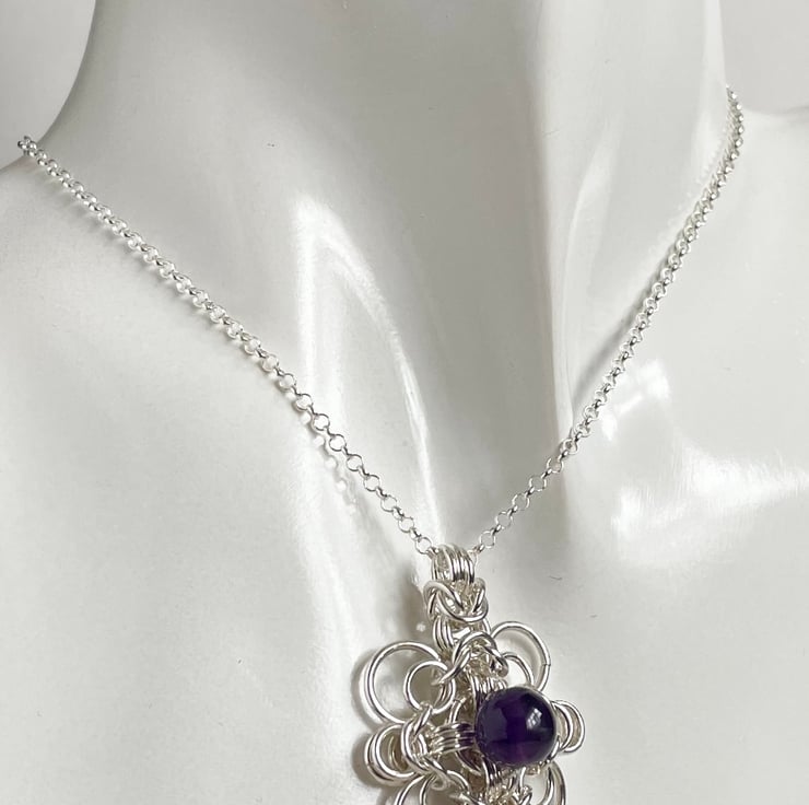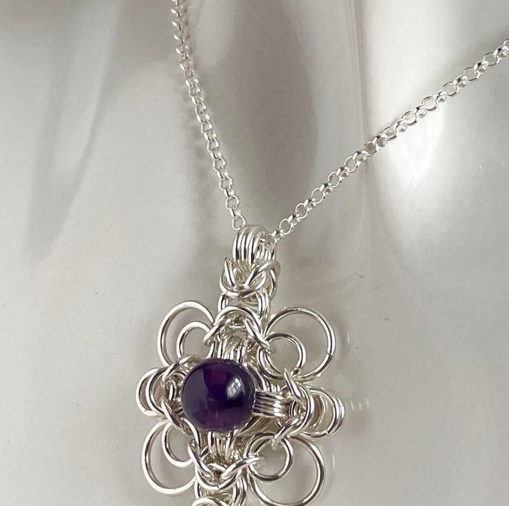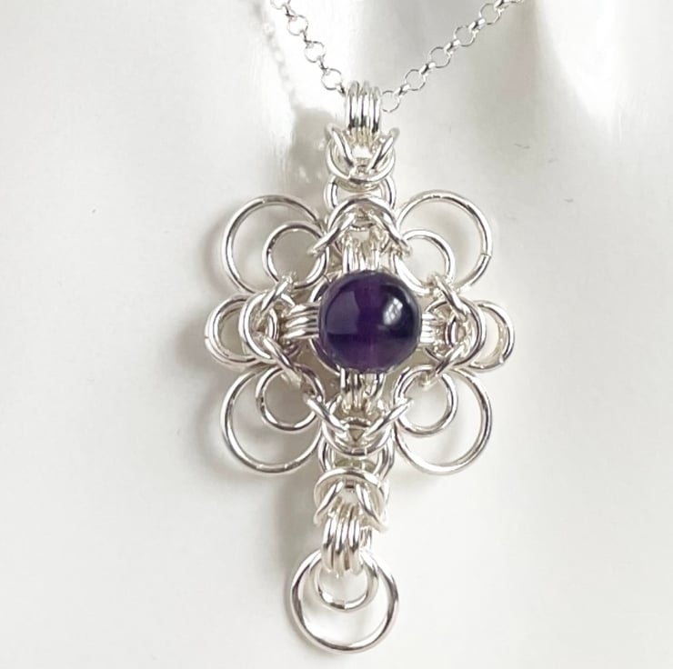Amethyst Sterling Silver Celtic style Byzantine chainmaille pendant with an 18 or 20 inch Sterling Silver chain.