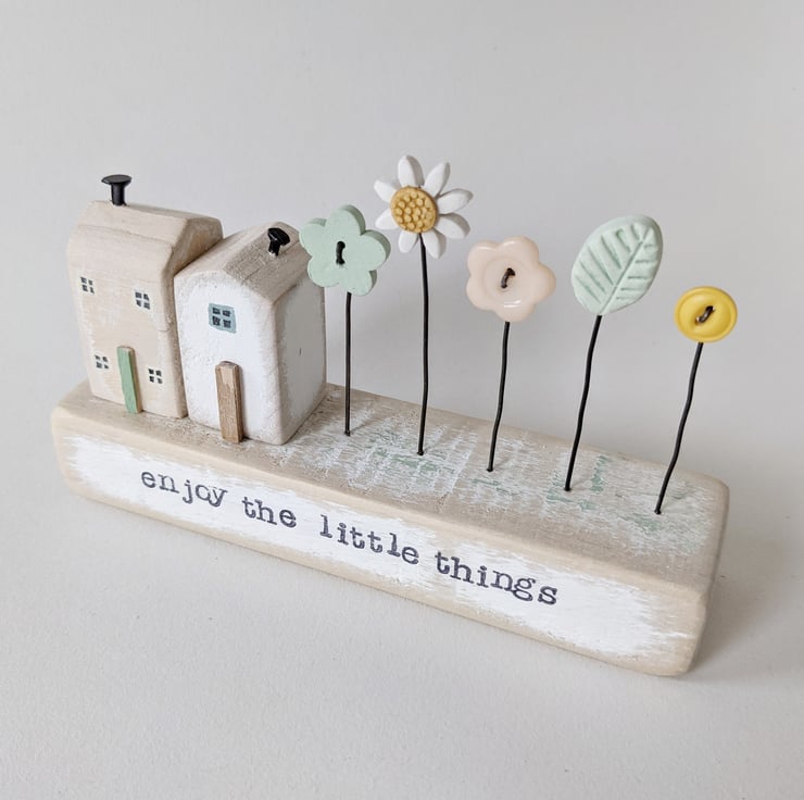 These little hand-painted wooden homes have teeny doors and windows and a garden of button and clay flowers.