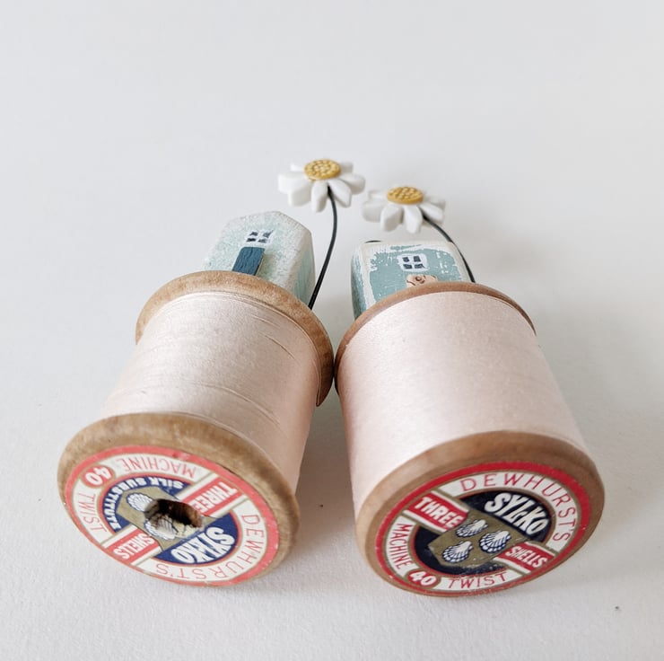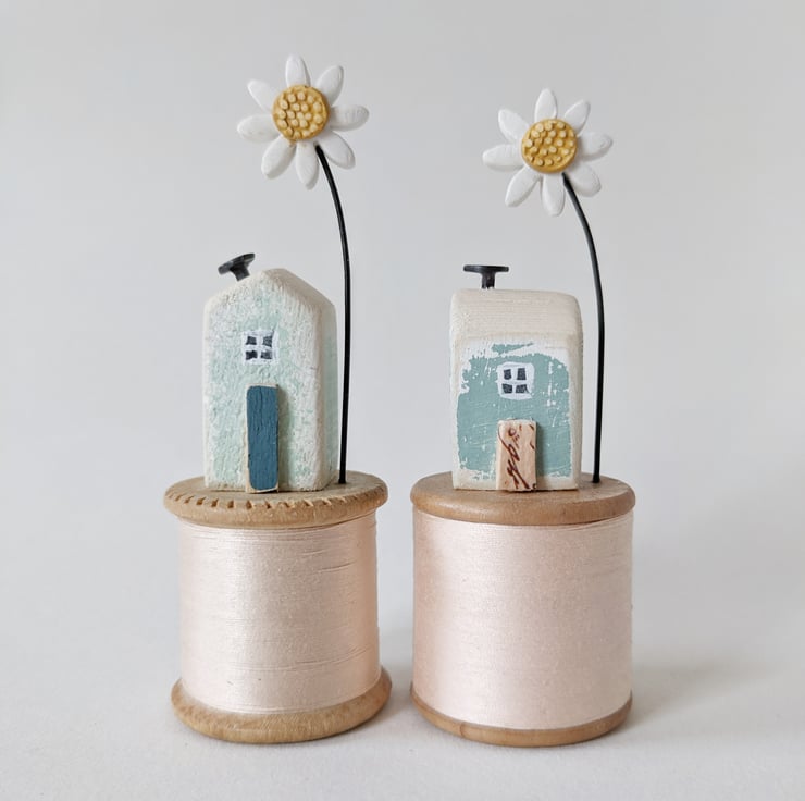 A hand painted little wooden house sits on a vintage bobbin. A patterned and painted clay daisy stands beside it.