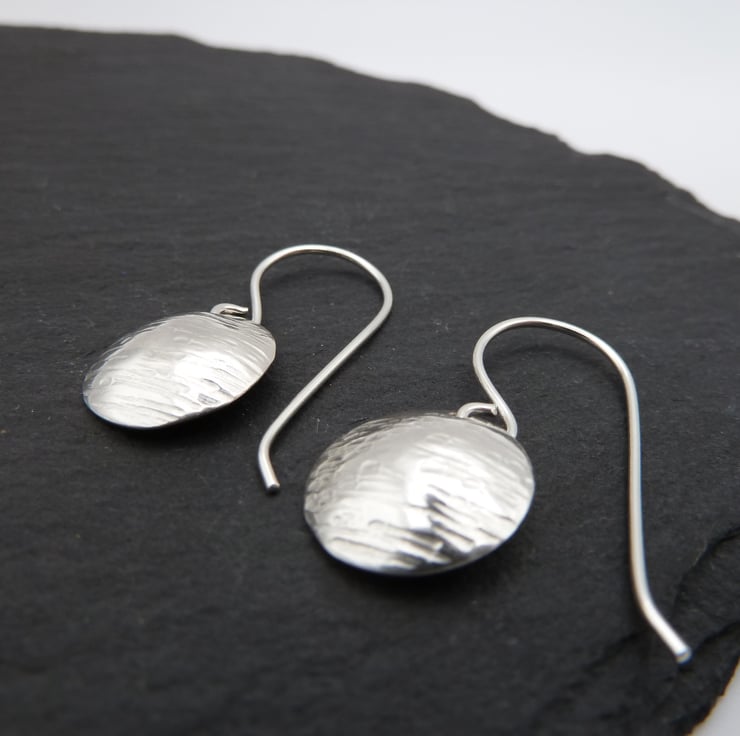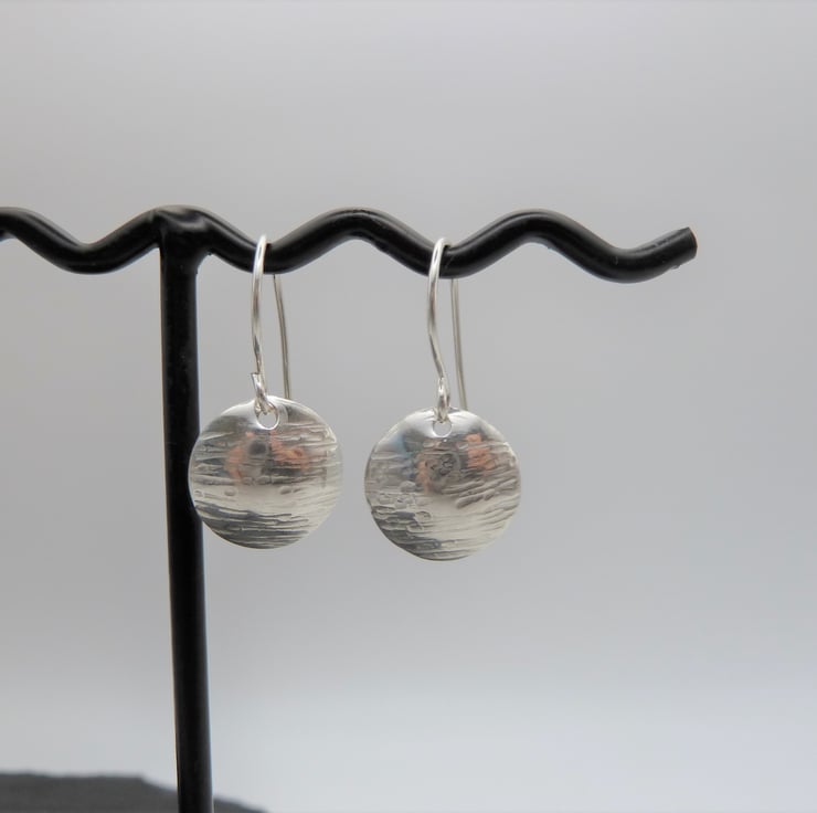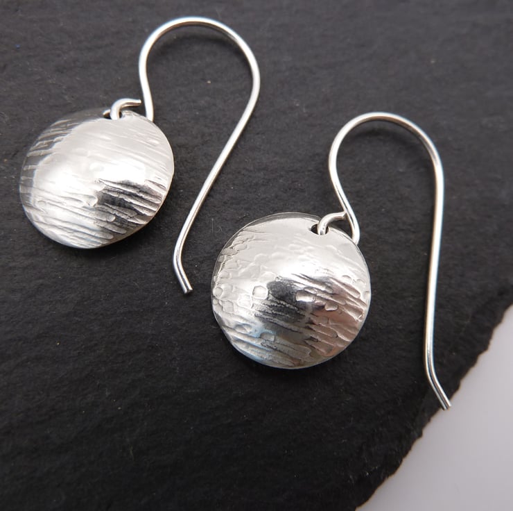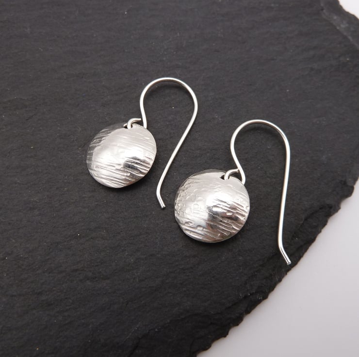 A pair of earrings made with handmade sterling silver ear wires and handmade sterling silver discs which have a hammered pattern and have been domed.