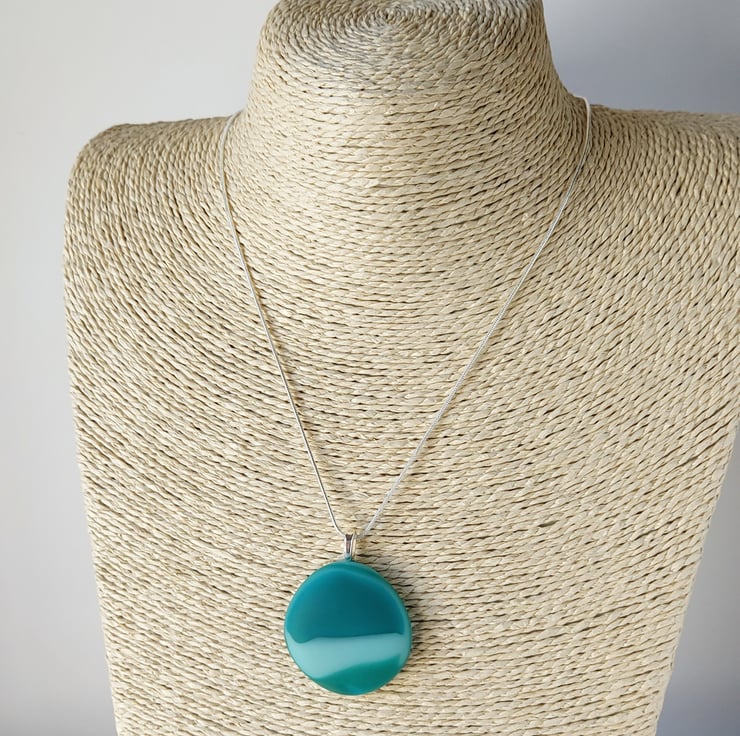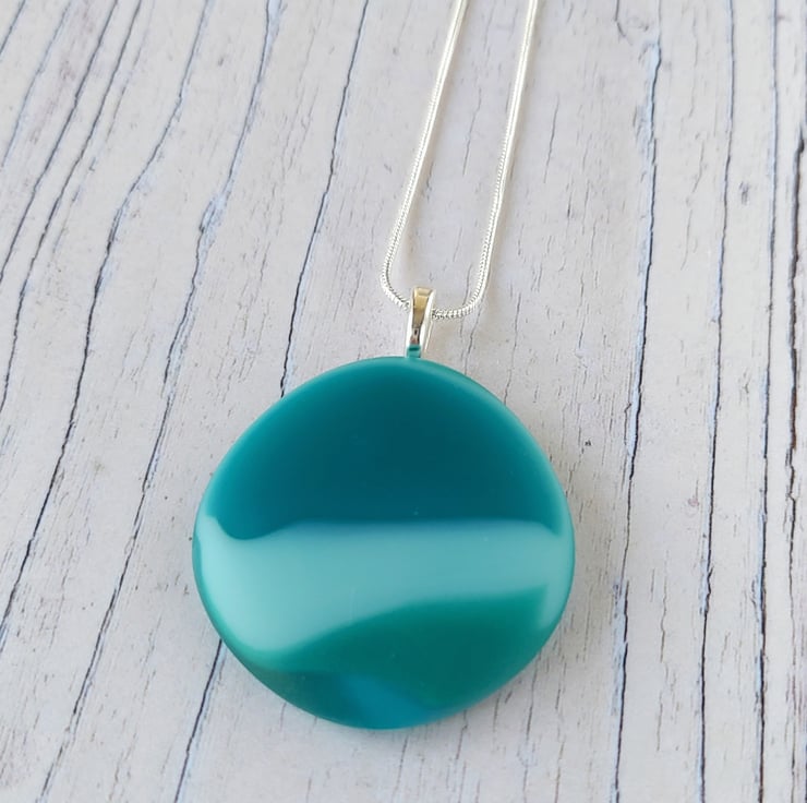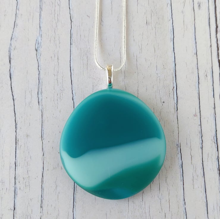 Round teal and turquoise striped fused glass pendant, handmade by me in my studio on the Wirral peninsula, UK.