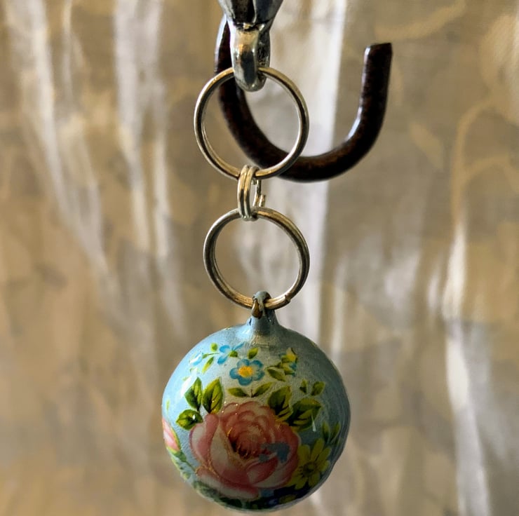 A vintage style Japanese bell charm which has a beautiful hand painted pink flower design on a mint green background. To hang on your purse or bag. Can be used as a keyring charm as it makes a jingle sound which is good to hear if lost in the bottom of your bag .