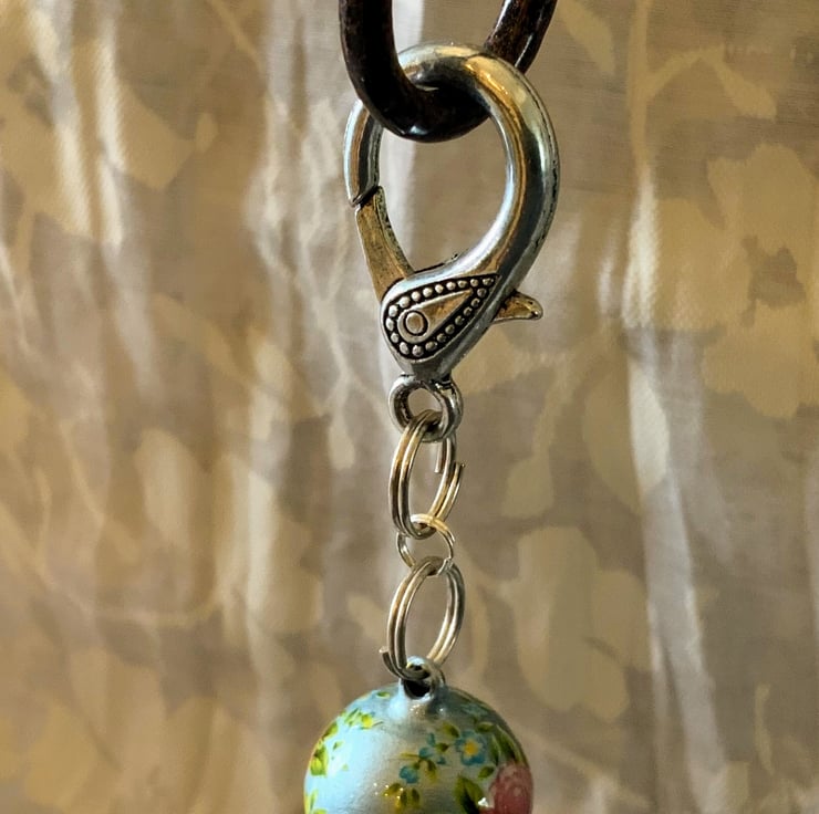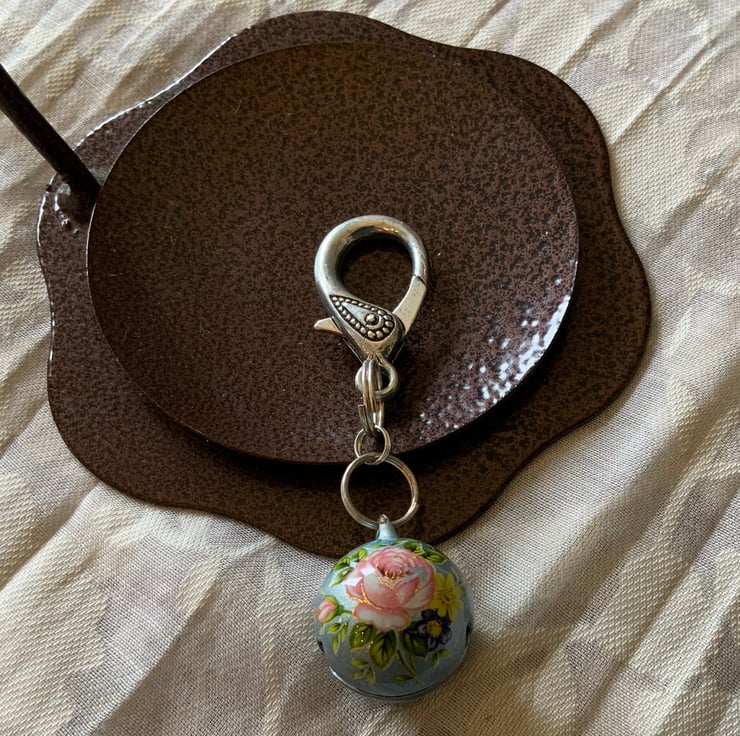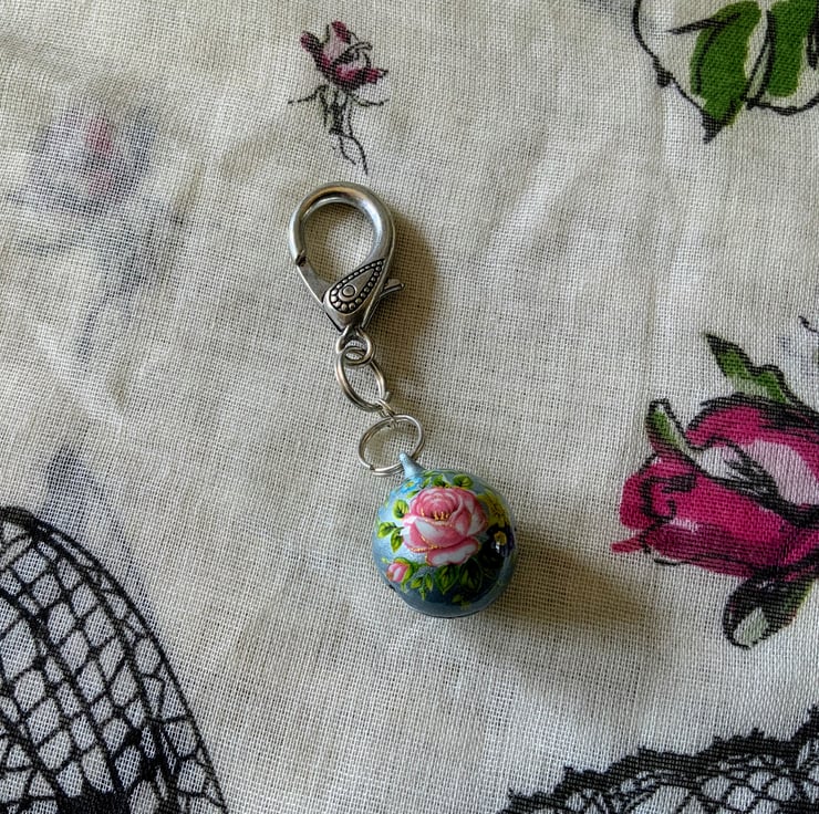 A vintage style Japanese bell charm which has a beautiful hand painted pink flower design on a mint green background. To hang on your purse or bag. Can be used as a keyring charm as it makes a jingle sound which is good to hear if lost in the bottom of your bag .