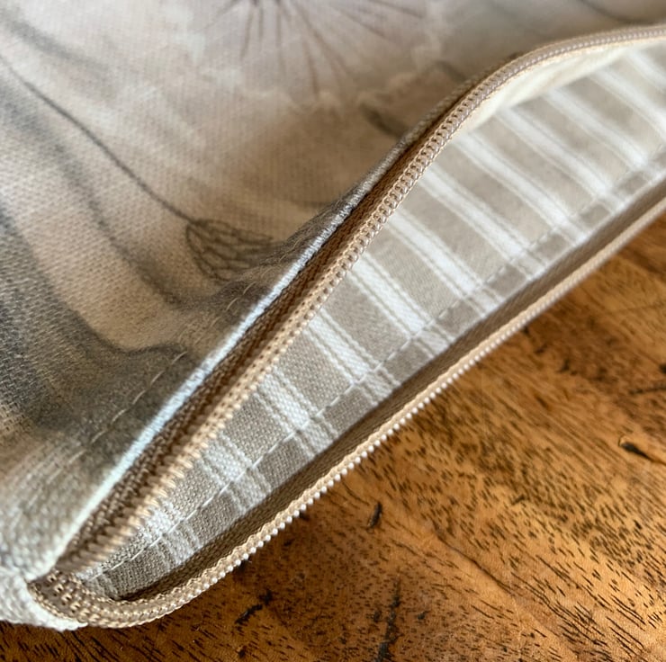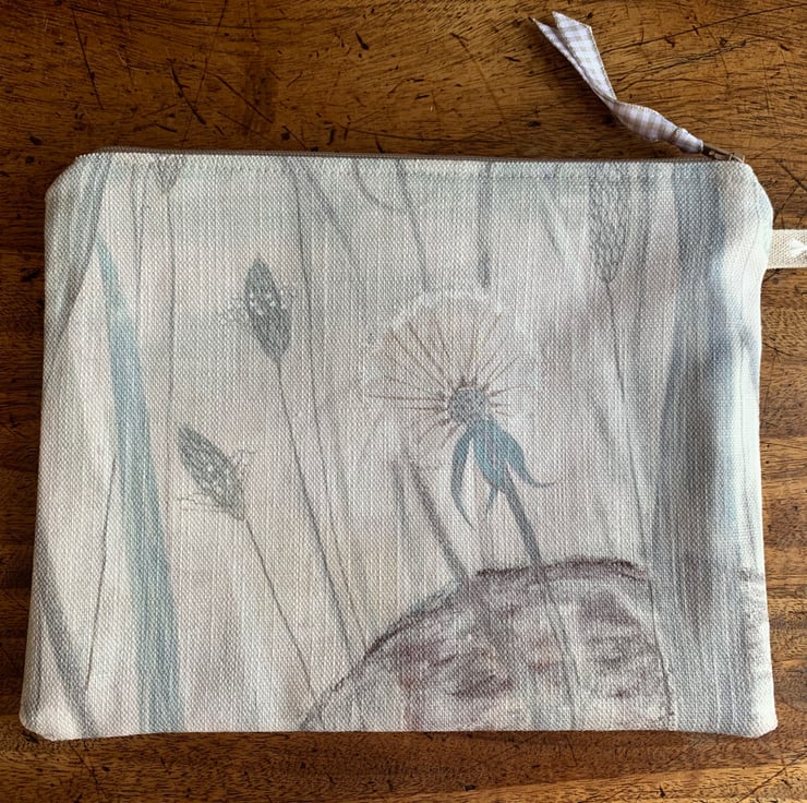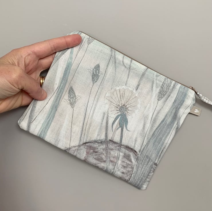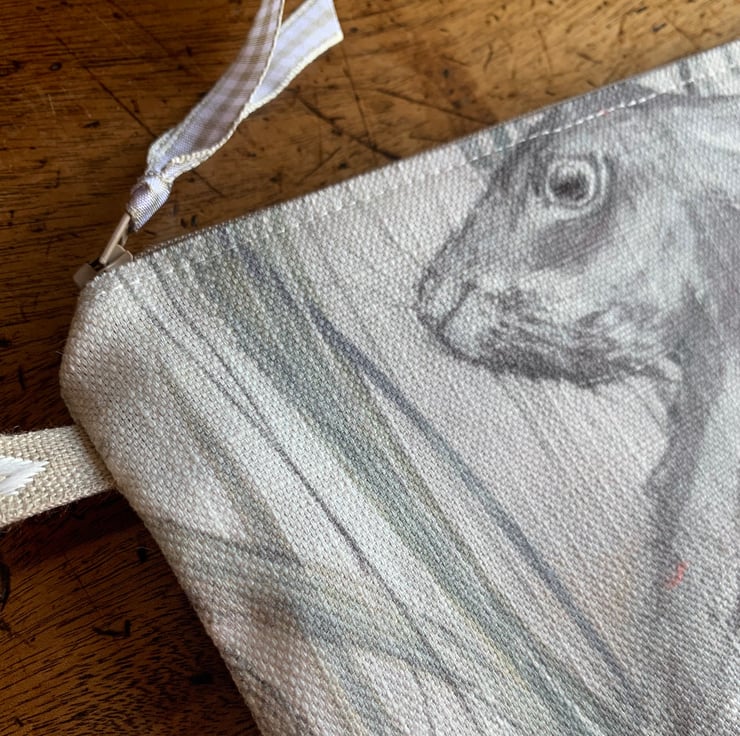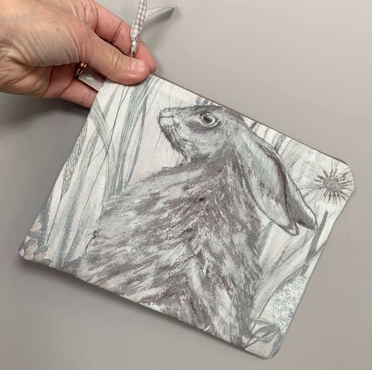 Useful zip pouch made from Sanderson Dune Hares cotton and linen mix fabric. It is fully lined with beige striped cotton.