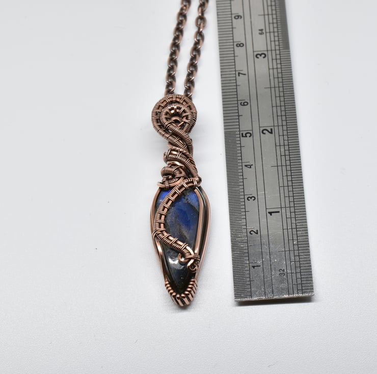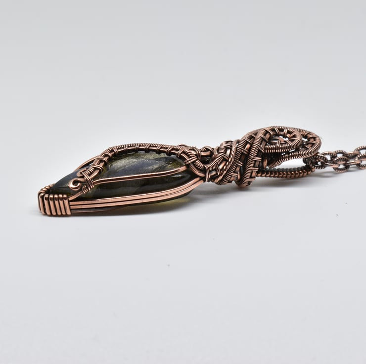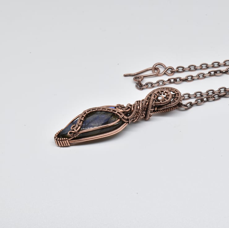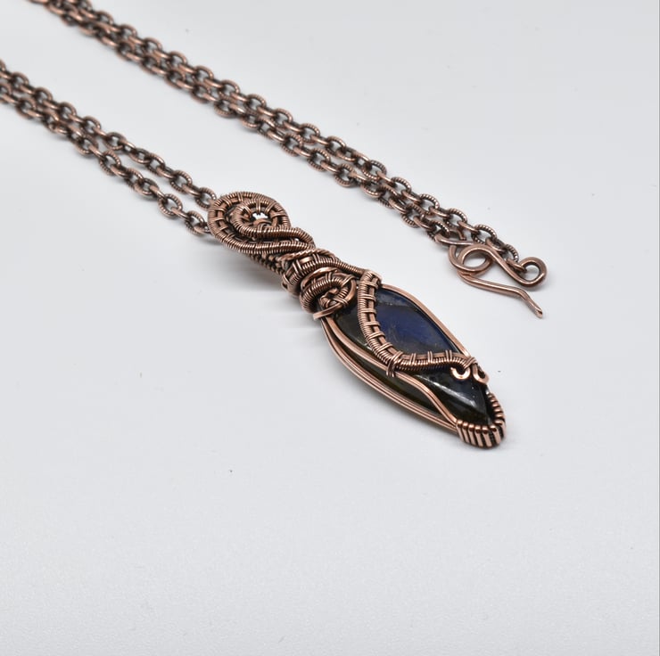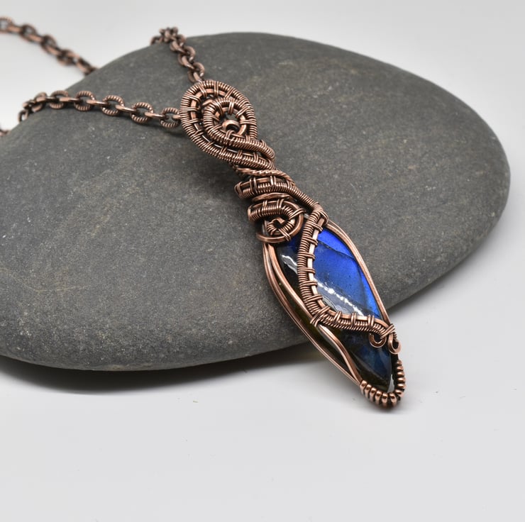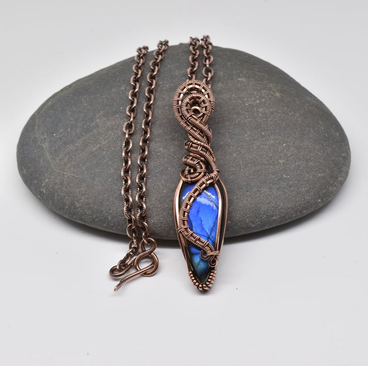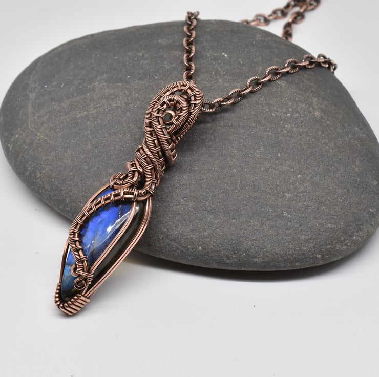 I have wrapped and woven around this beautiful blue labradorite using solid copper wire to make this heady style unisex pendant.