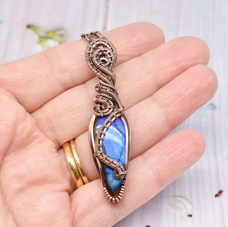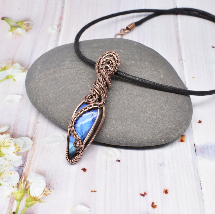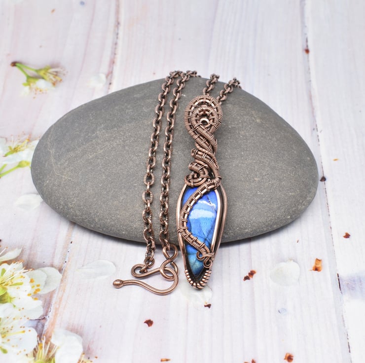 I have wrapped and woven around this beautiful blue labradorite using solid copper wire to make this heady style unisex pendant.