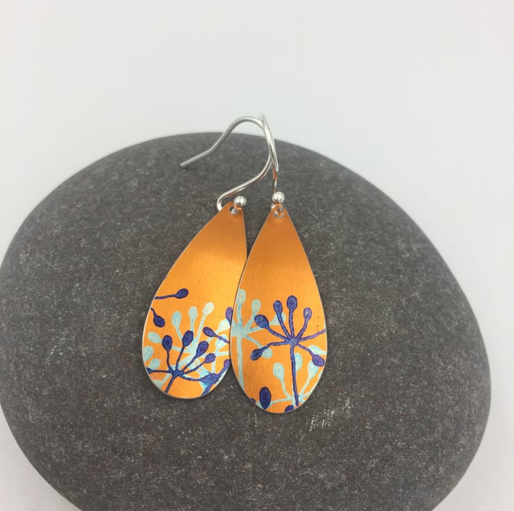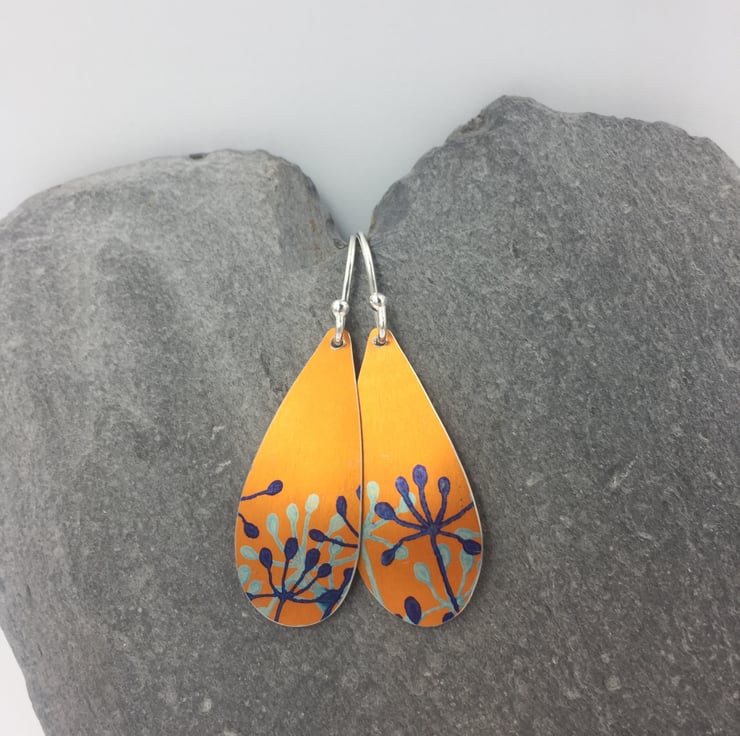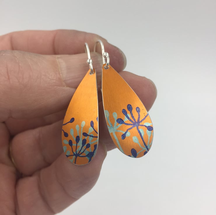 Hand printed and pierced drop shaped earrings in orange. The printed design is cow parsley in navy and turquoise. They hang from sterling silver ear hooks and measure approx 4cm in length.