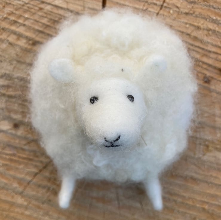 This adorable little wall plaque has been needle felted using white woollen fibres. The sheep has been made in three dimensions with the head protruding from the surface. A top coat of curly wool locks has been added. The eyes are beaded and the legs made from wool wrapped wire. The whole sheep has then been mounted onto a wooden circle which has a small brass hanger attached to the reverse to facilitate mounting.