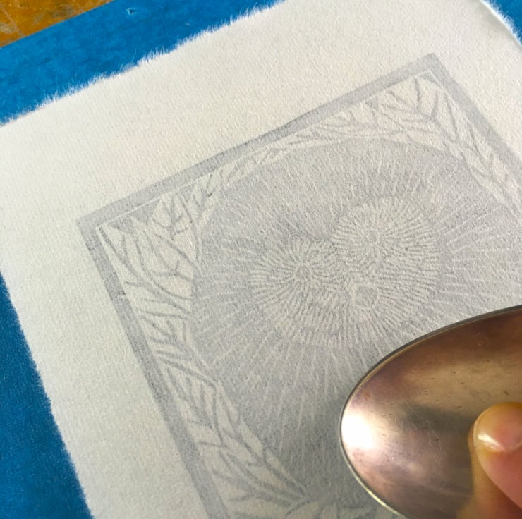 Linocut is a relief printmaking process where an image is transferred or drawn directly in reverse onto the lino block. It is then carved using mainly U and V shaped gouges into the surface of the lino. Ink is then applied to the block and paper laid onto the inked surface. The paper is then hand burnished or pressed and the print lifted from the block.