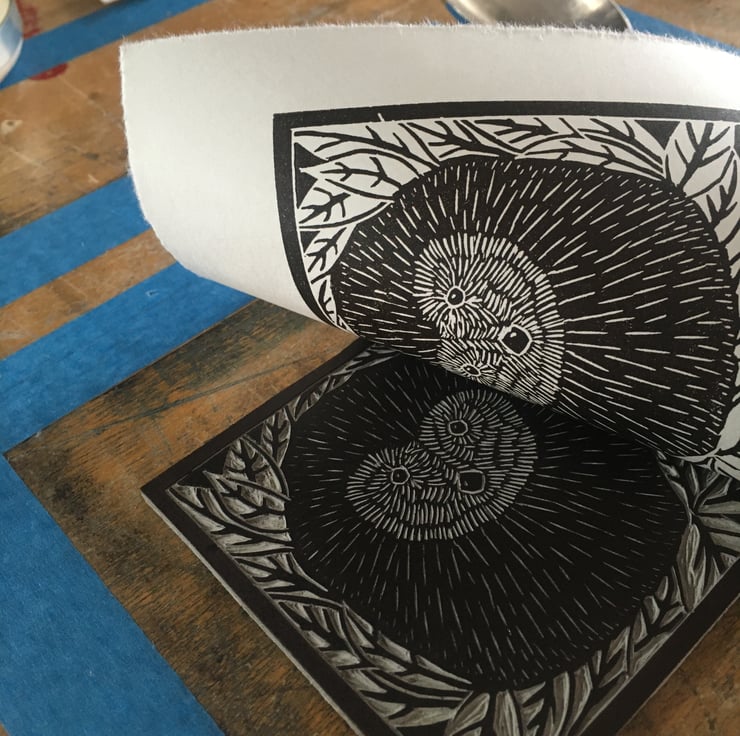 "Hedgehog" is created using the relief printmaking method of linocut printing. As each print is created by hand there may be tiny variations which add to the individual beauty of each original artwork. "Hedgehog" is printed onto Okawara 51gsm printmaking paper from Awagami Factory in Japan.