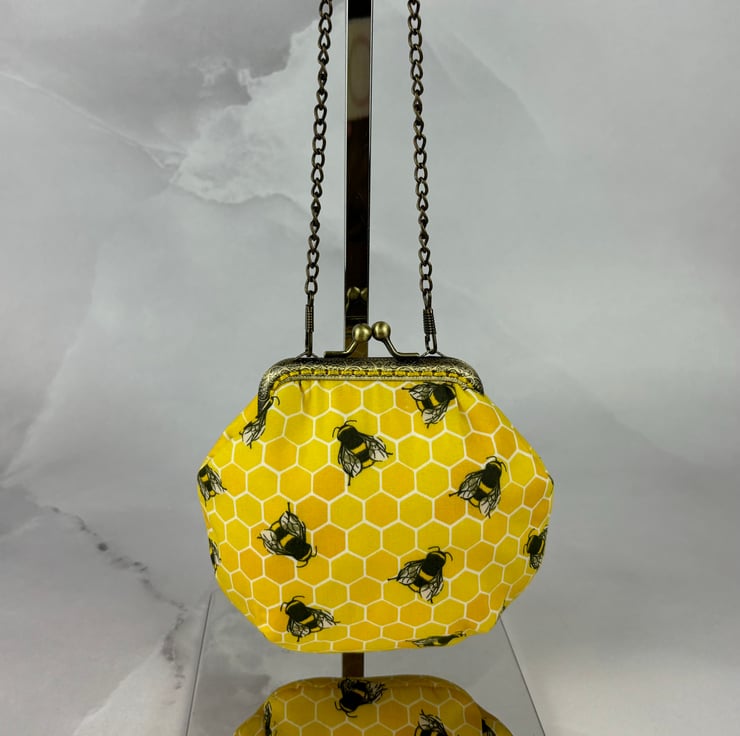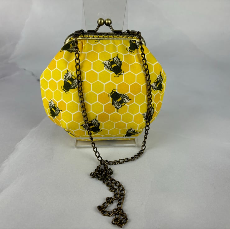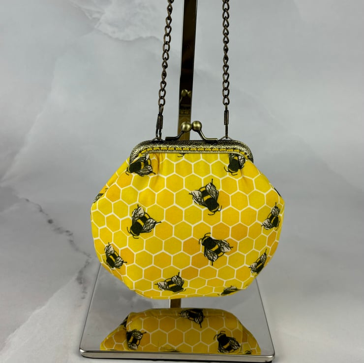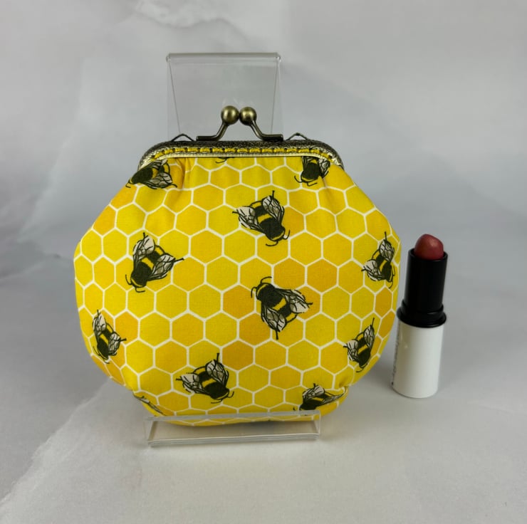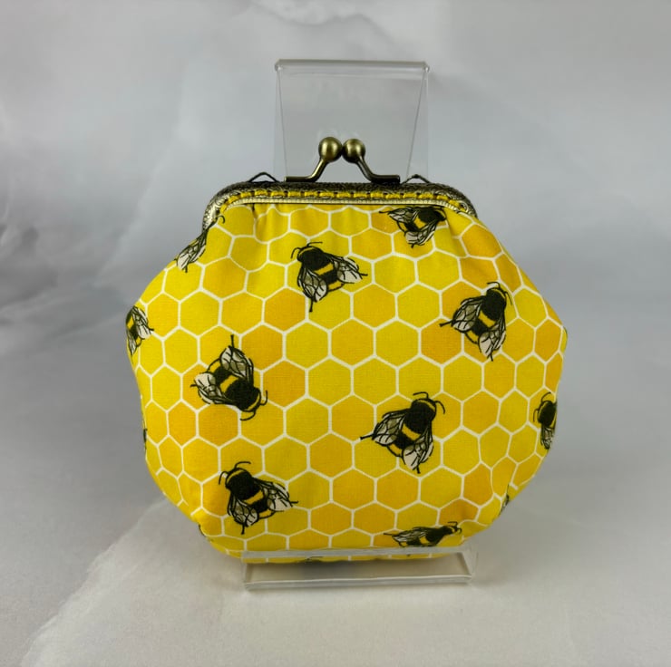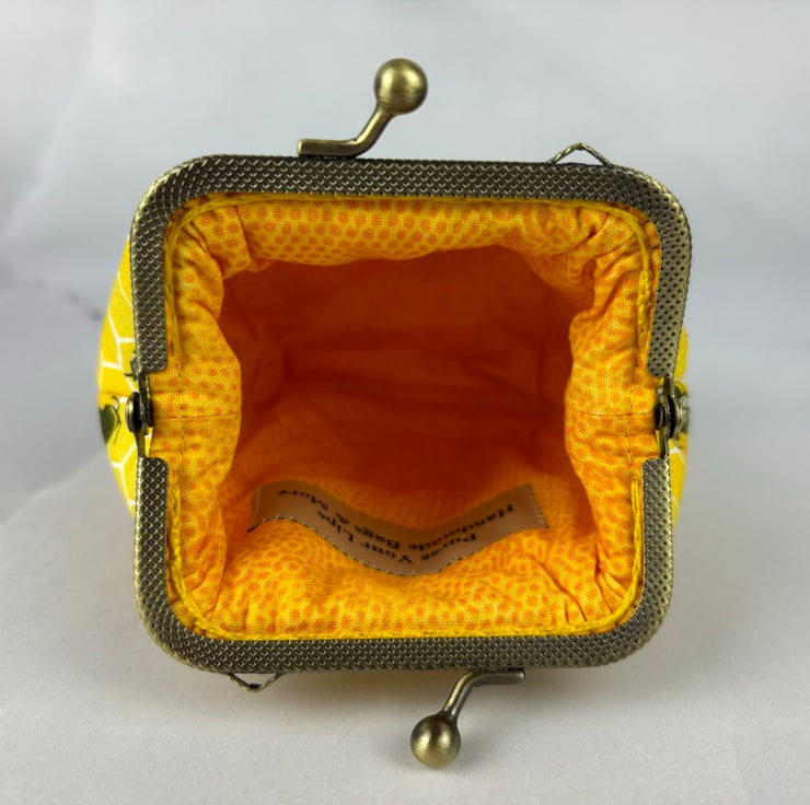 Handmade kiss clasp coin purse in a fun yellow honeycomb pattern cotton fabric.