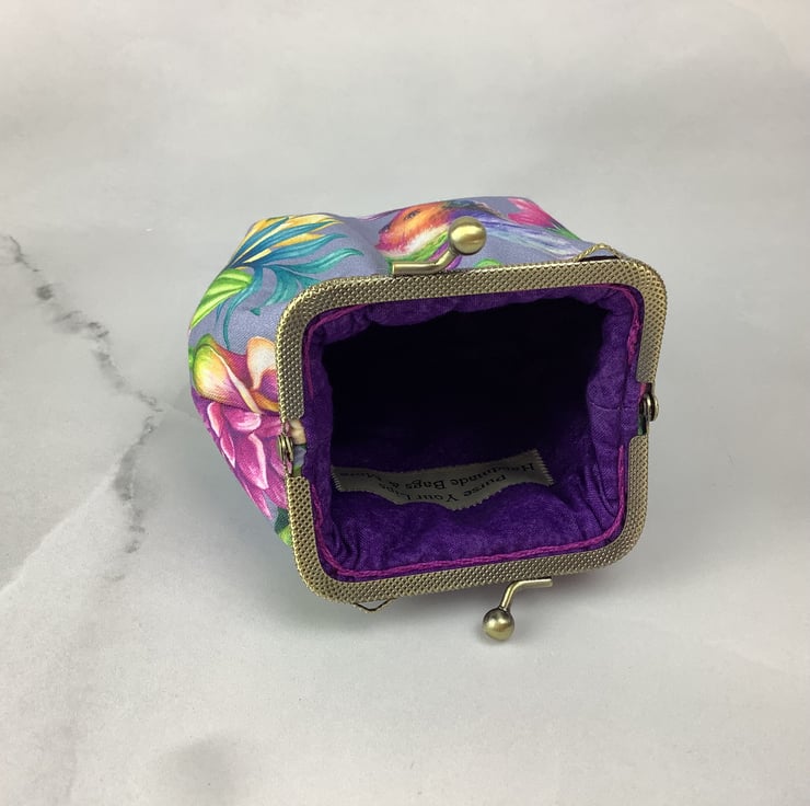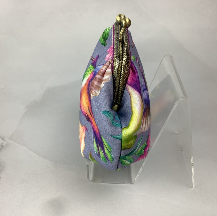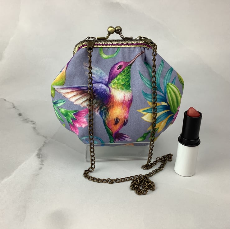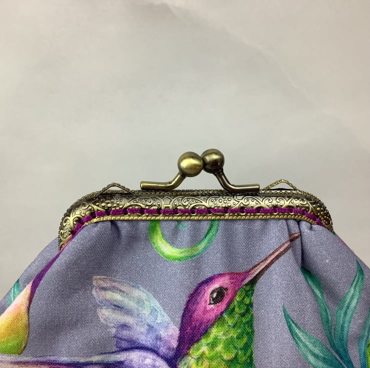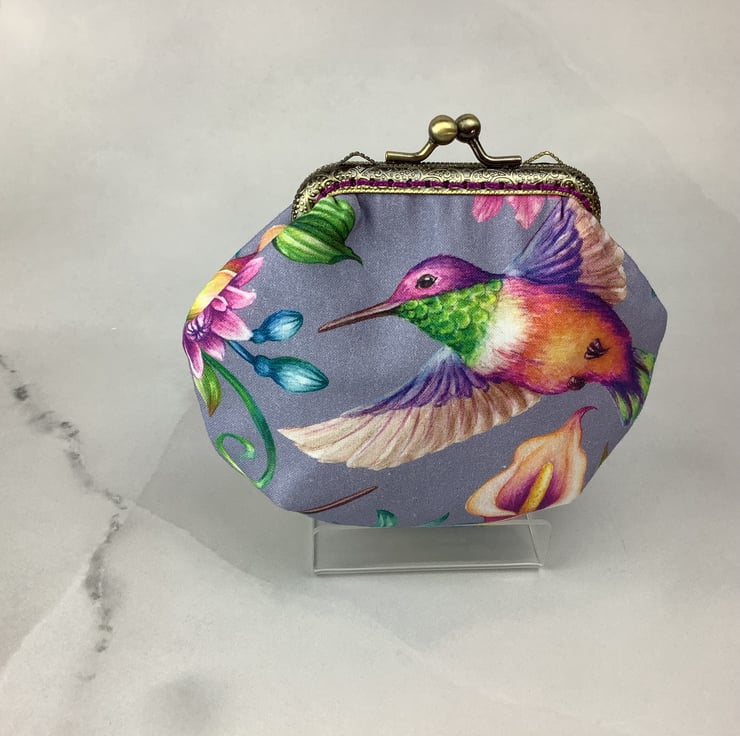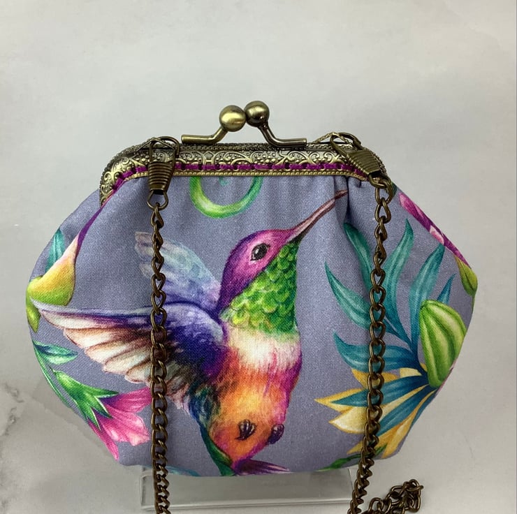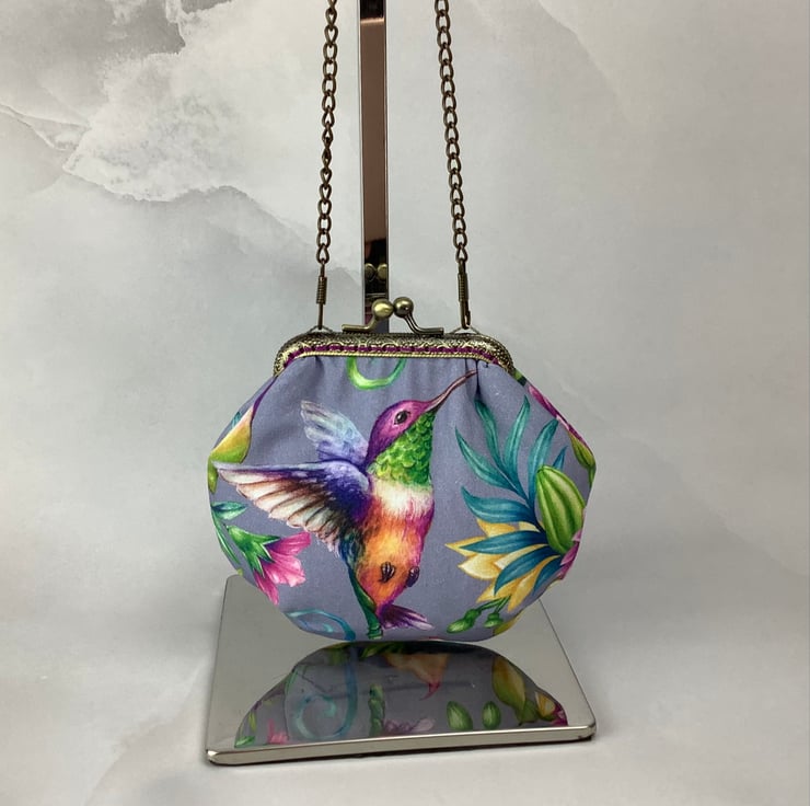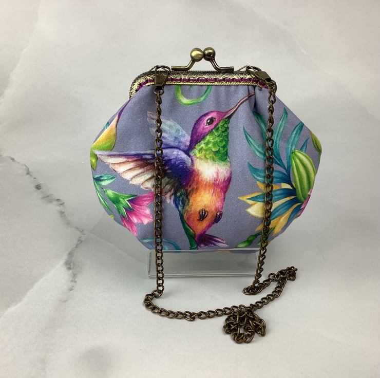 Hummingbirds small clutch bag with a kiss clasp frame in a pretty cotton fabric with hummingbirds surrounded by tropical flowers.