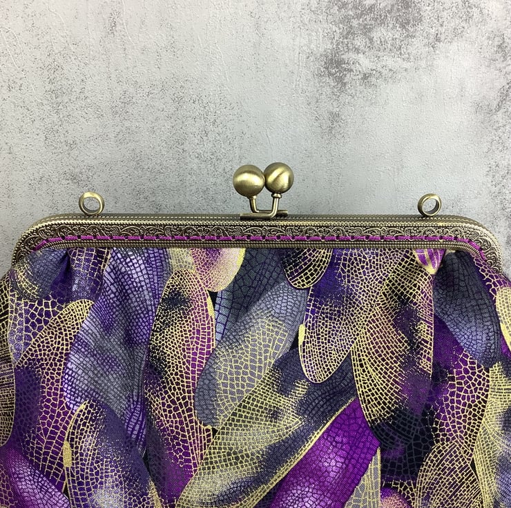 The metal kiss lock frame is hand stitched using thick pearl cotton thread in a complimentary tone.