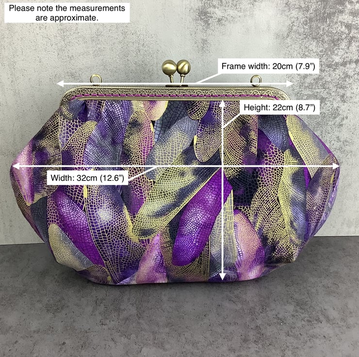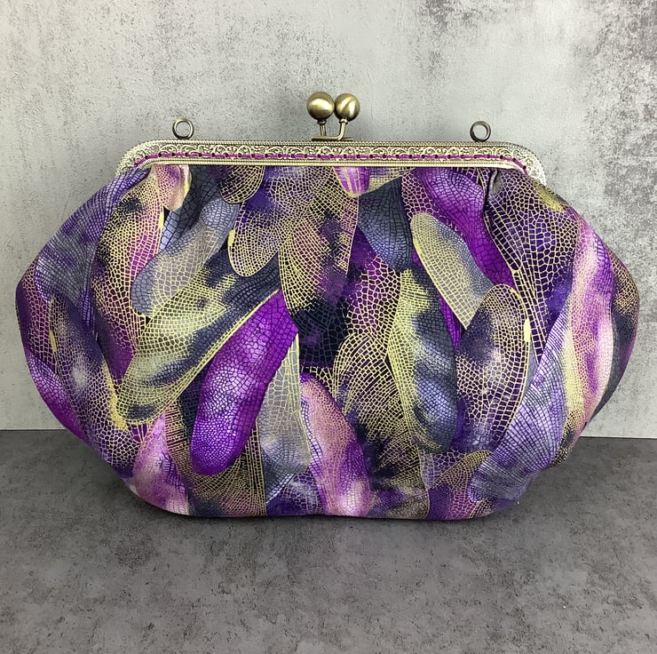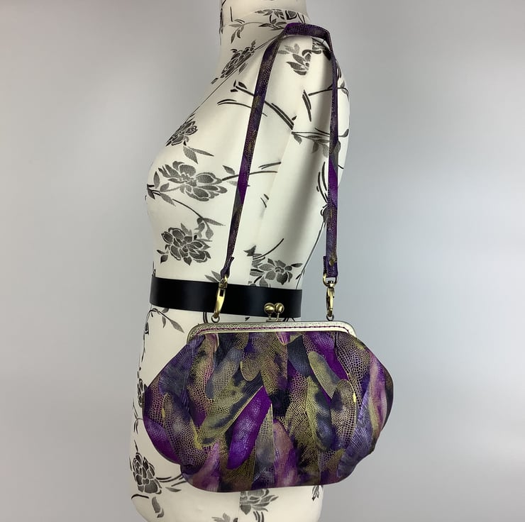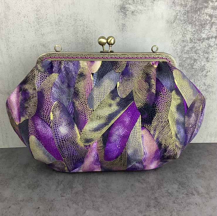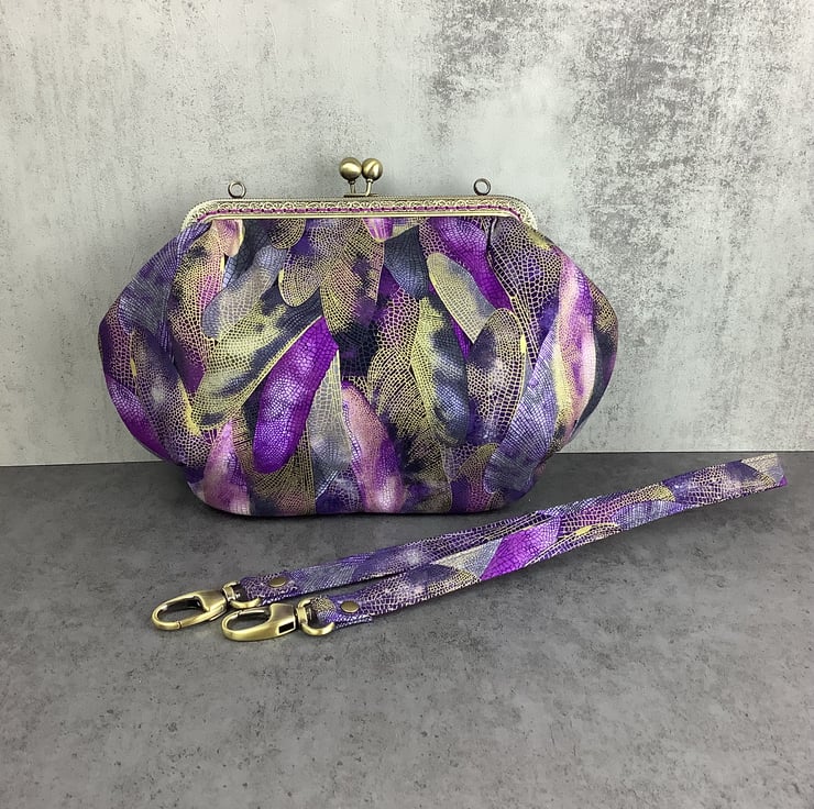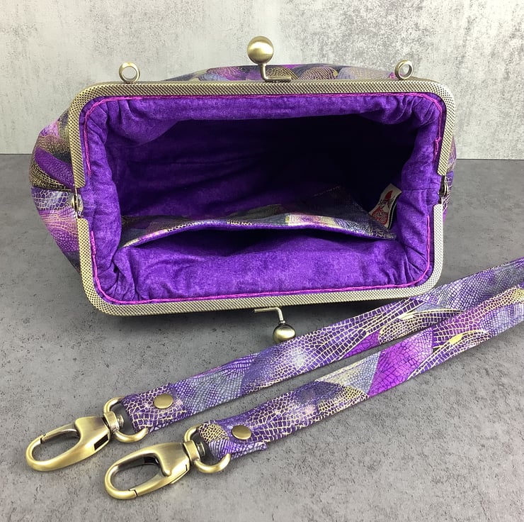 I have lined it in a rich purple mottled cotton and the matching detachable shoulder length strap allows it to sit comfortably on your shoulder.