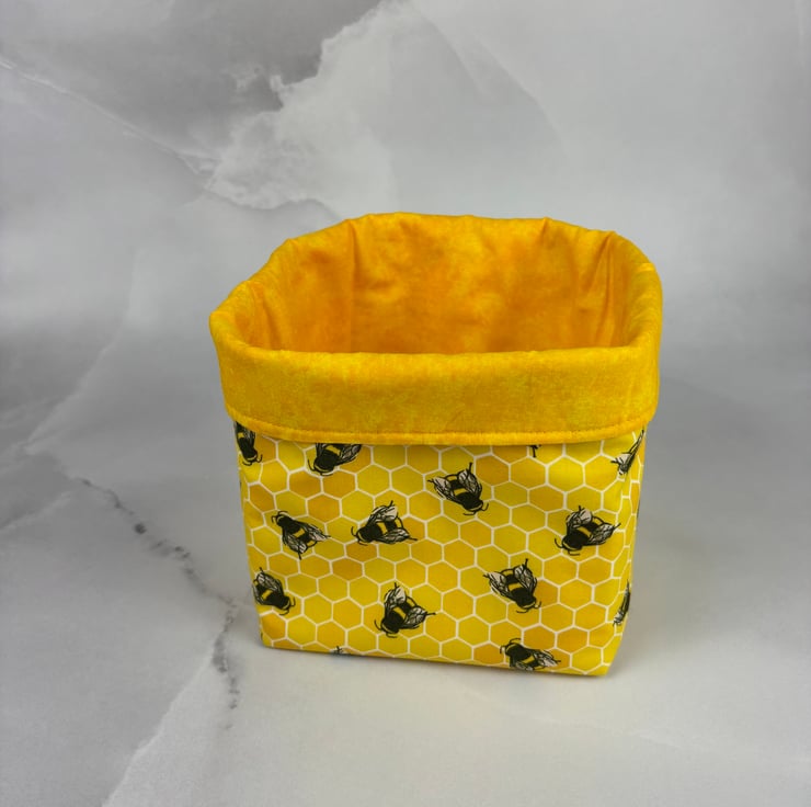 Handmade fabric basket in a fun honeycomb pattern cotton fabric with chubby bumble bees and lined in a rich yellow cotton.