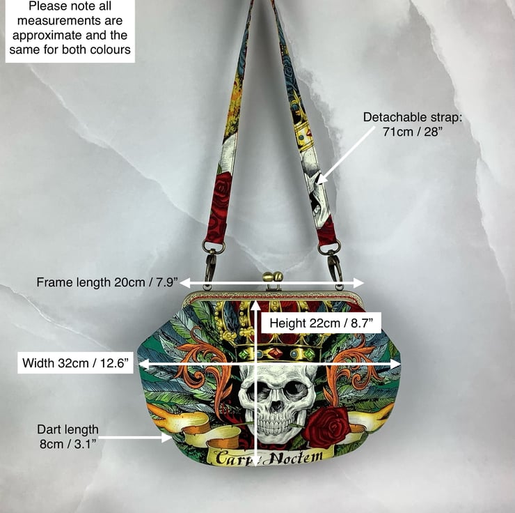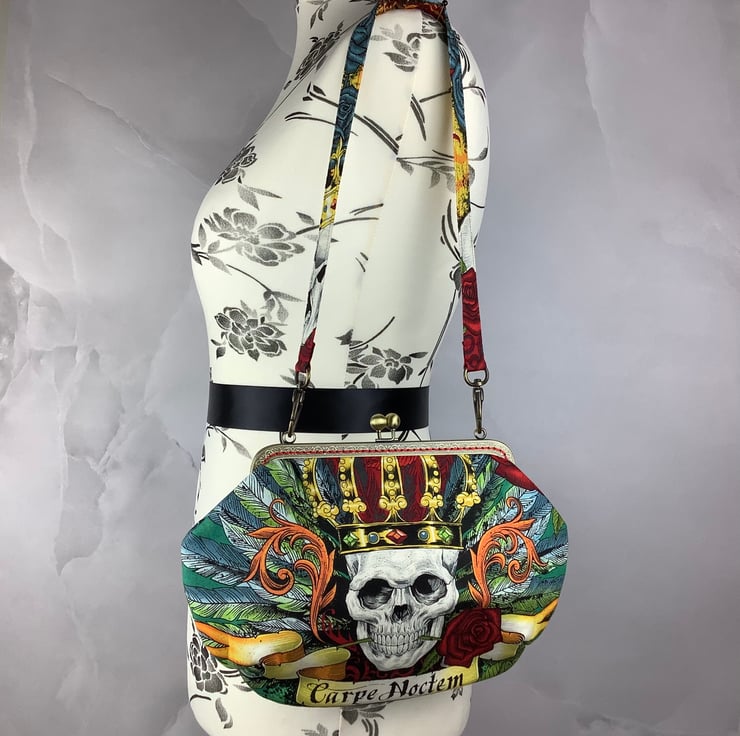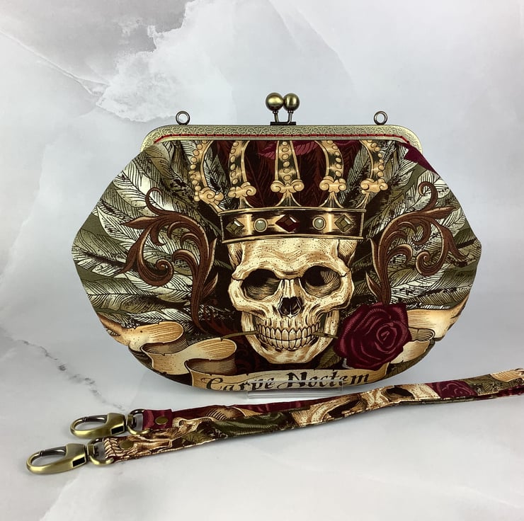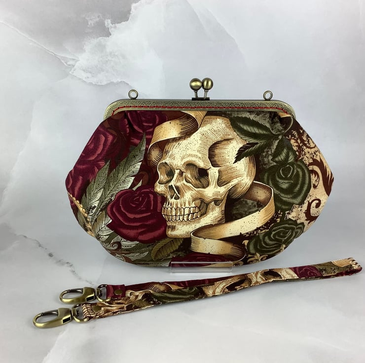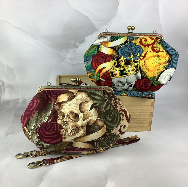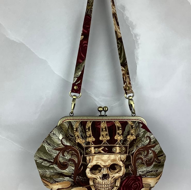 Handmade frame clutch bag with a kiss clasp frame in a stunning gothic cotton fabric in a choice of colourway.