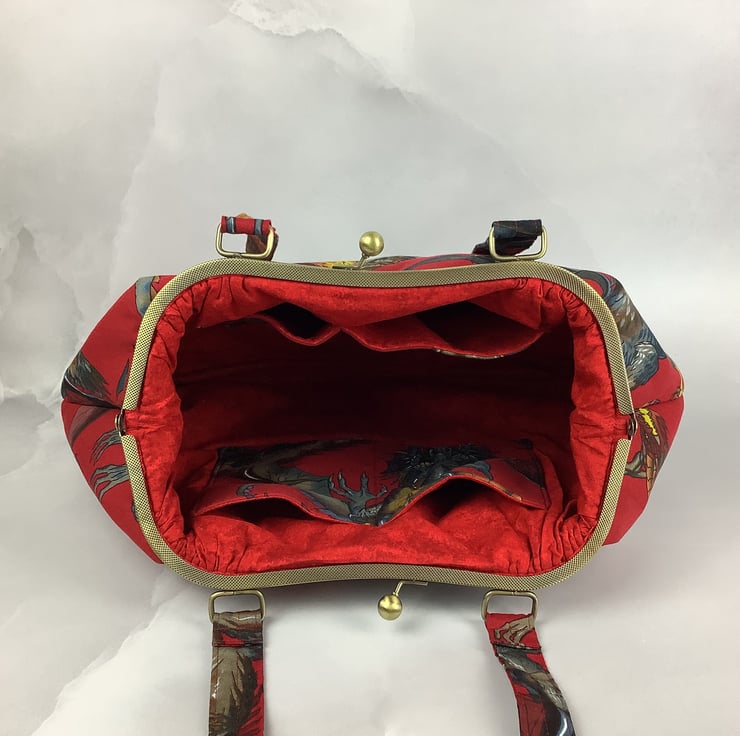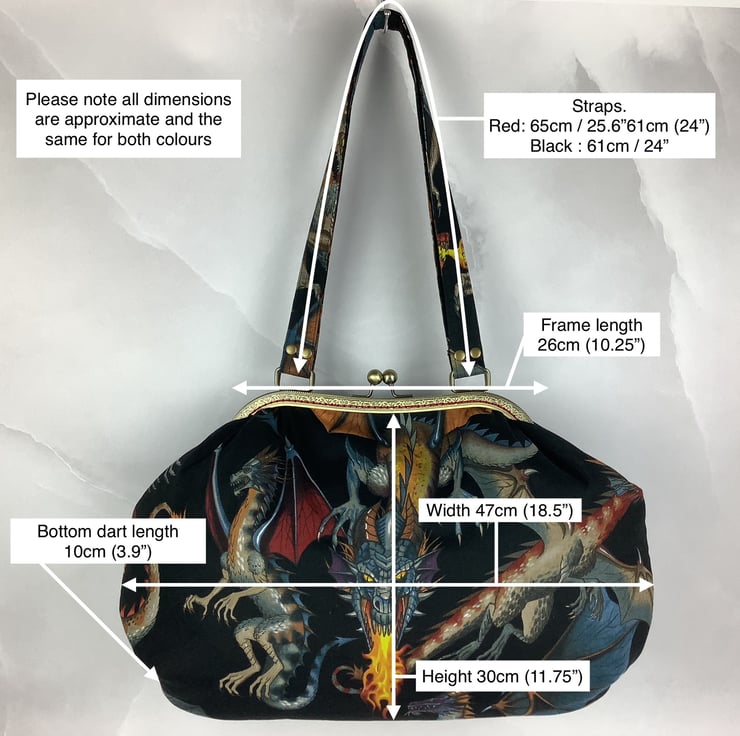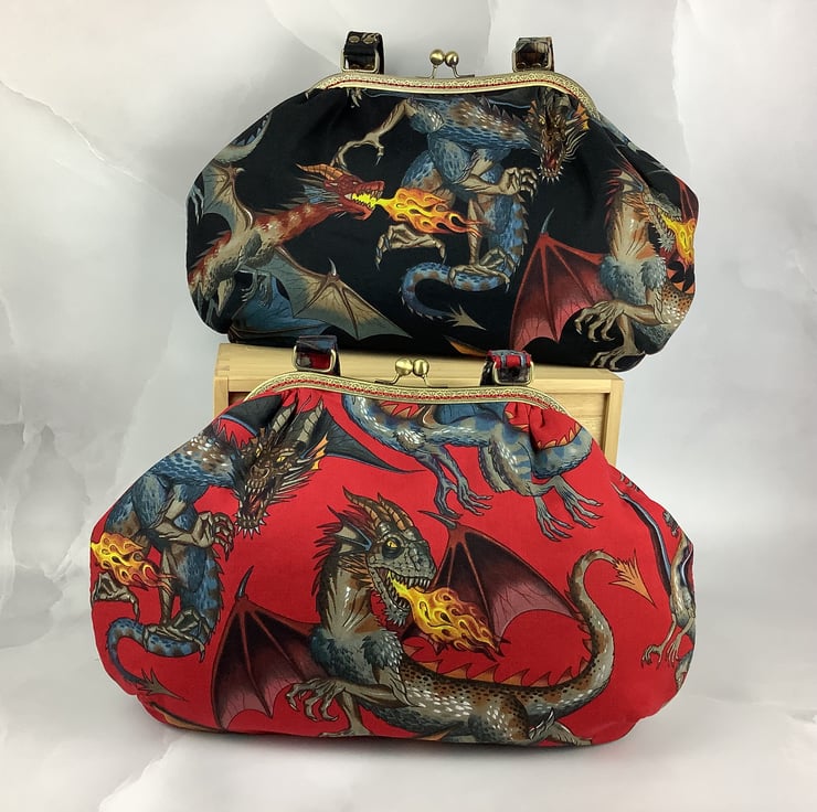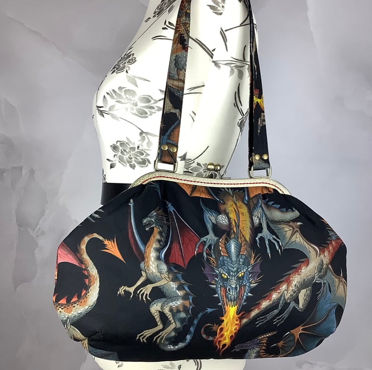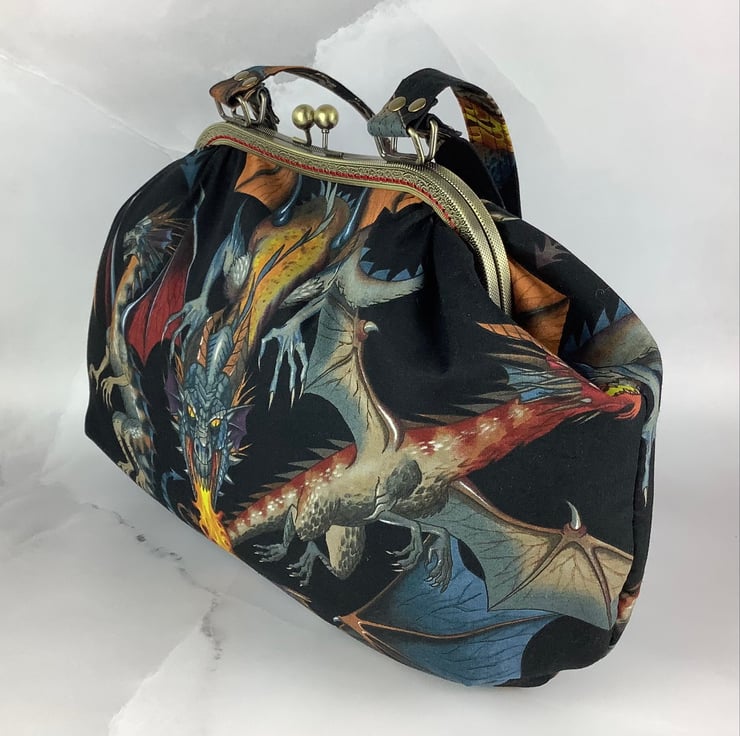 Handmade kiss clasp bag in a stunning fire breathing dragons cotton fabric.