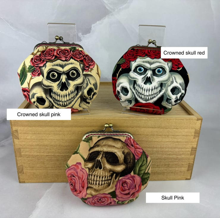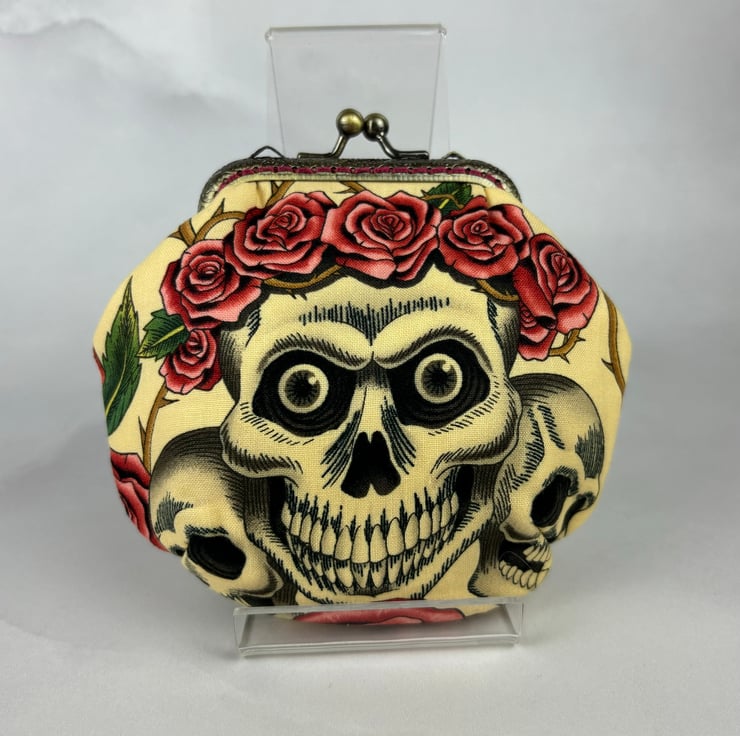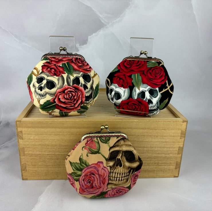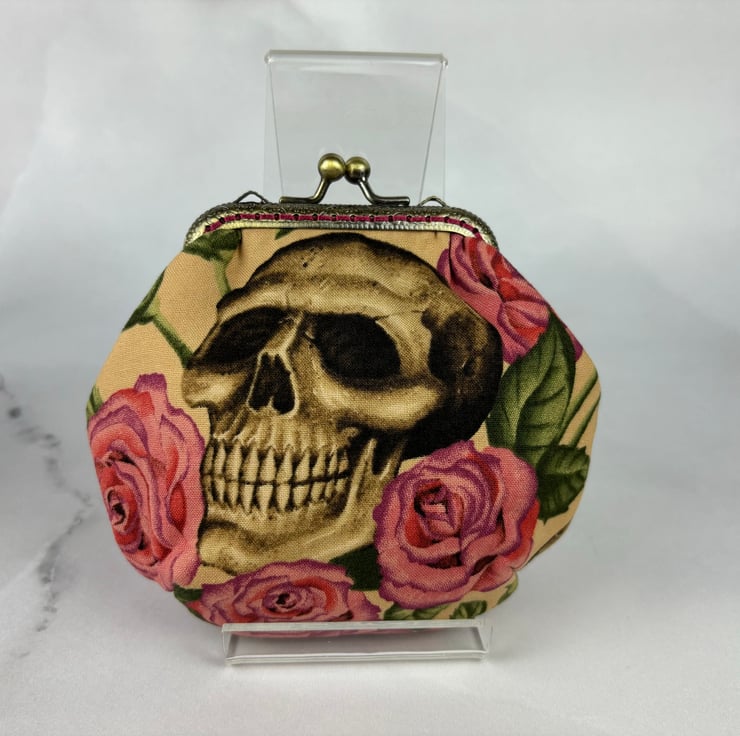 Handmade kiss clasp coin purse in a choice of stunning gothic inspired skulls and roses cotton fabrics. Lined in complimentary cottons, with a dense interlining giving it a lovely plush feel and bottom darts add shape and some structure.