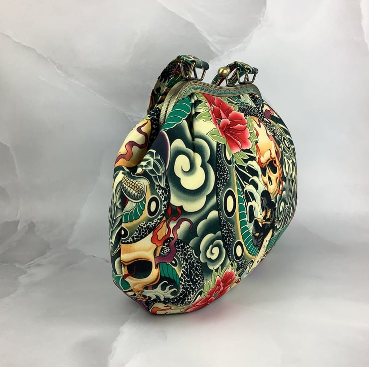 Handmade kiss clasp bag in a stunning oriental style gothic cotton fabric in bold colours with a Japanese vibe.