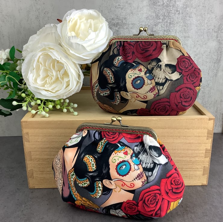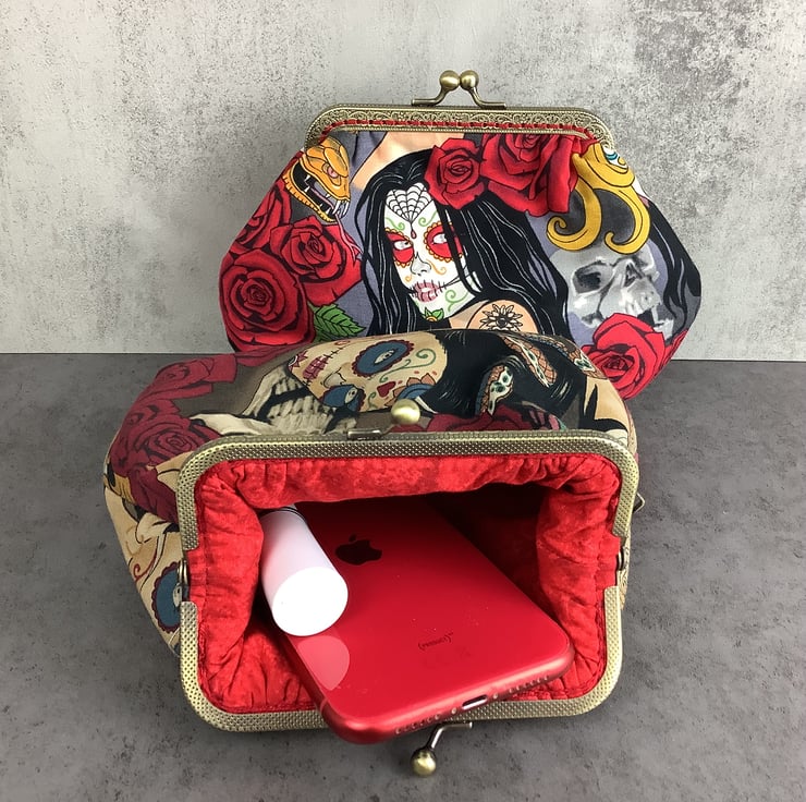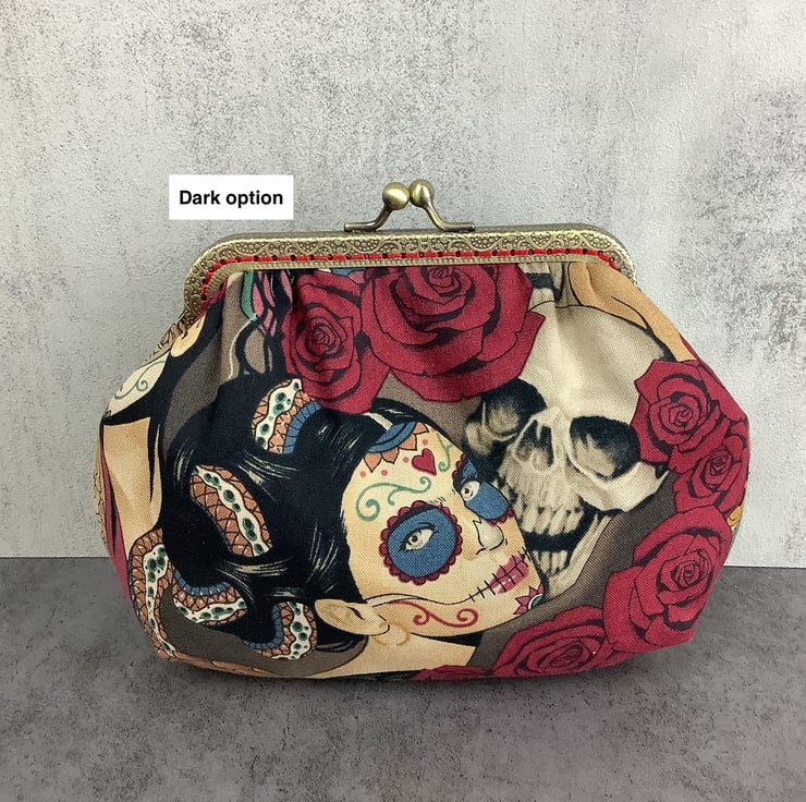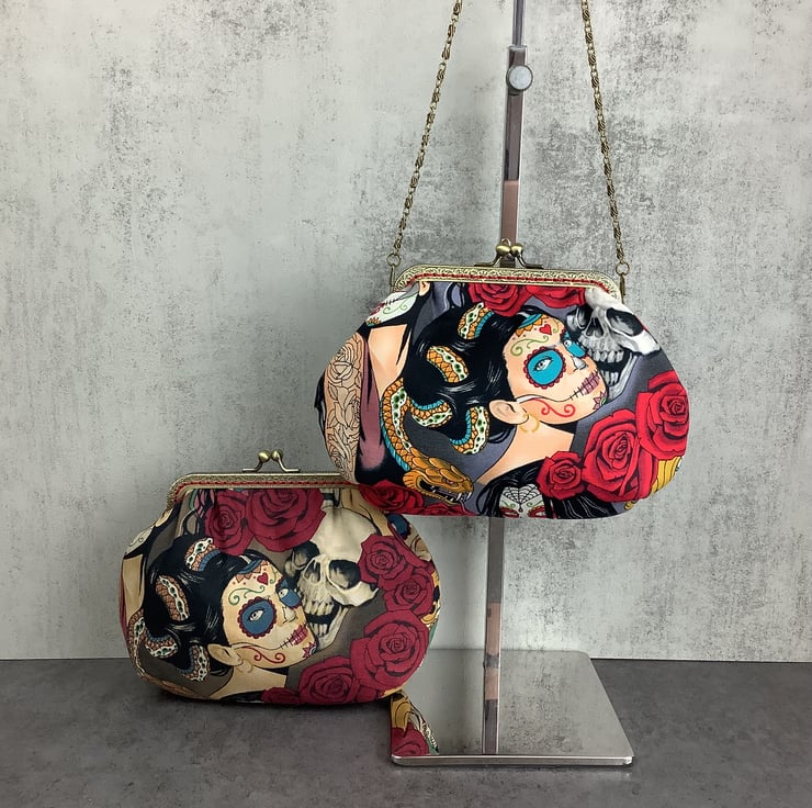 Handmade bag with a kiss clasp frame in a choice of striking gothic cotton fabrics.
