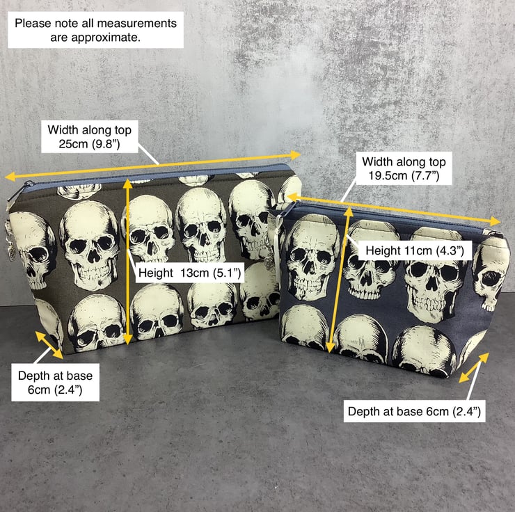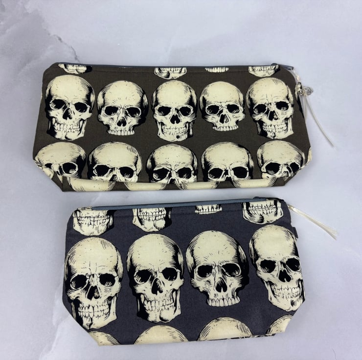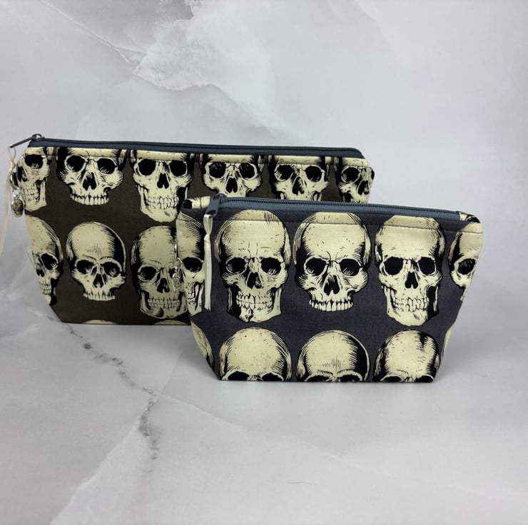 Handmade flat bottomed zip bag in a striking modern gothic cotton fabric in 2 sizes.