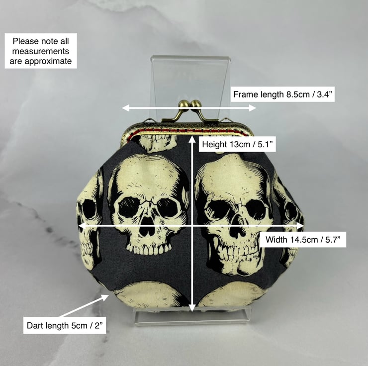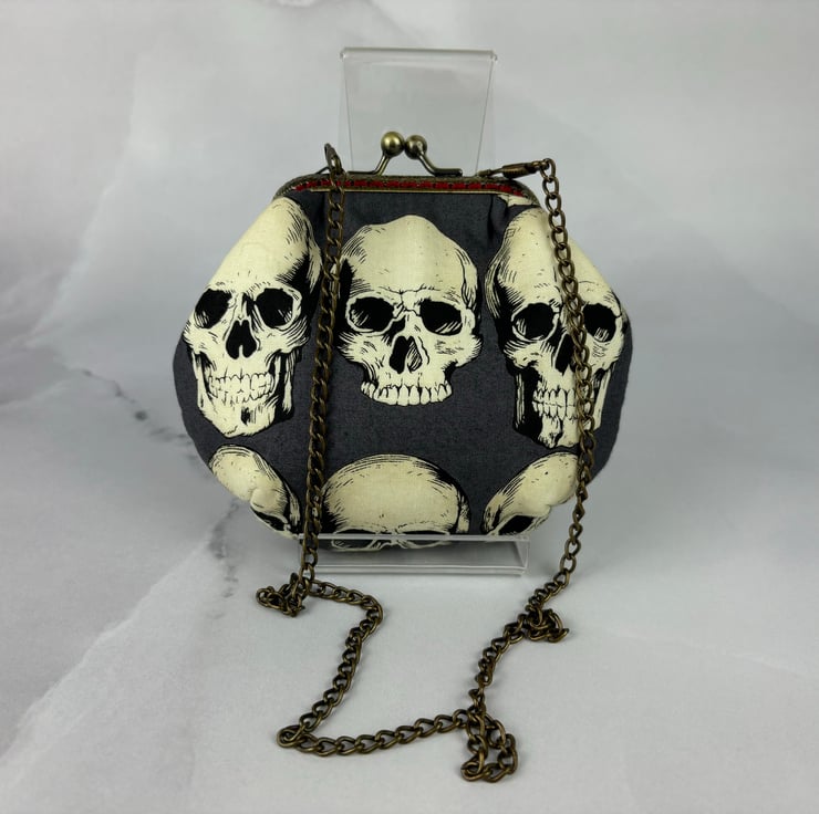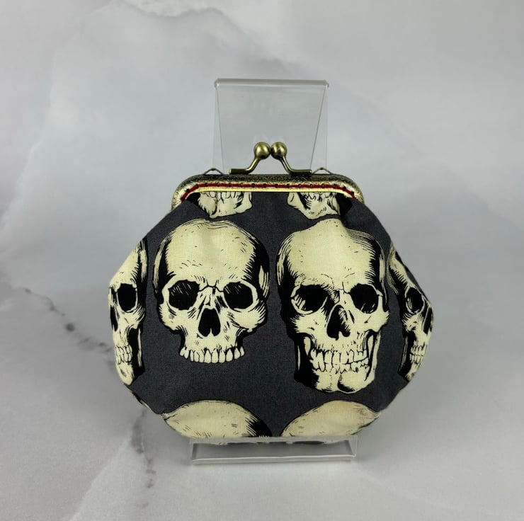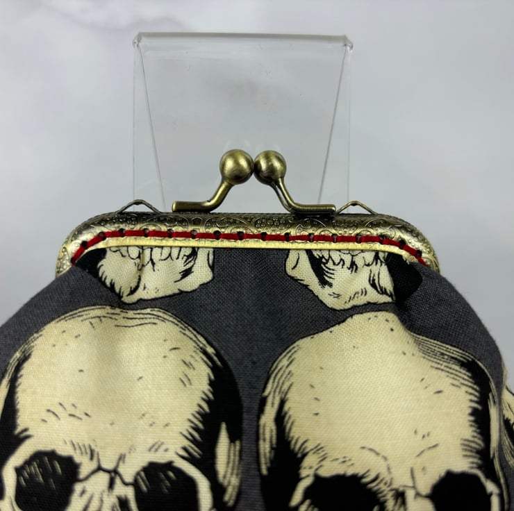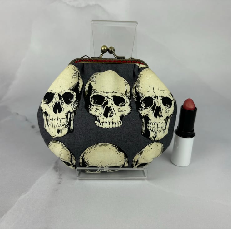 Handmade kiss clasp coin purse in a striking modern gothic cotton fabric, lined in a rich red mottled cotton, with a dense interlining giving it a lovely plush feel and bottom darts add shape and some structure.
