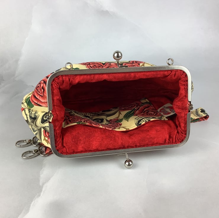 The silver coloured metal kiss lock frame is hand stitched using thick red pearl cotton thread.