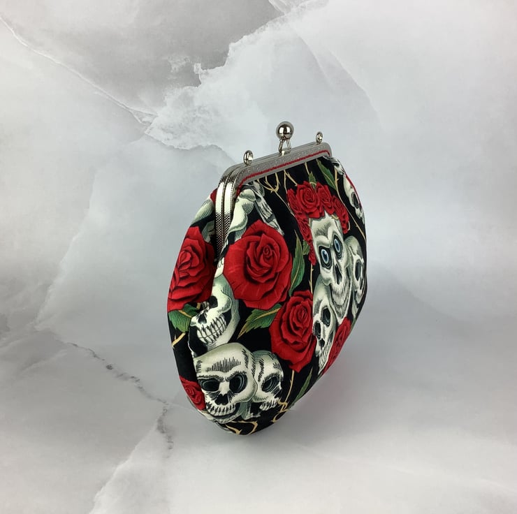Handmade clutch bag with a kiss clasp frame in a striking classic gothic cotton fabric and available in a choice of colours.